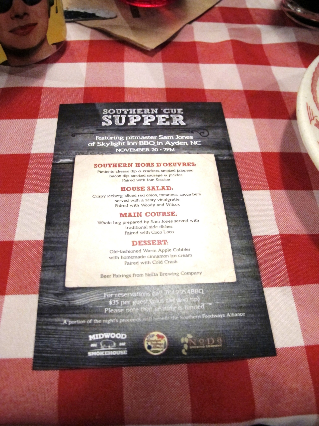 Speedy: Walking in, Monk and I were impressed with Sam’s custom built pit, which he made in order to smoke a whole hog exactly like he does at Skylight Inn. The hog was already off the pit by the time we arrived, but we could smell the coals, so we knew we were in for a treat. We arrived a little late (sorry, Monk) and were shown to our seats at a full family style table. It was a nice touch to eat family style with some new friends. The other nice touch was the beer pairing from NoDa Brewing with each course. It was definitely enjoyable, though that would have been a better treat on a non-school night.
