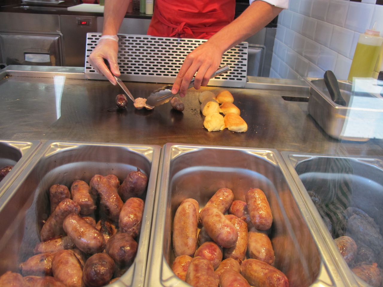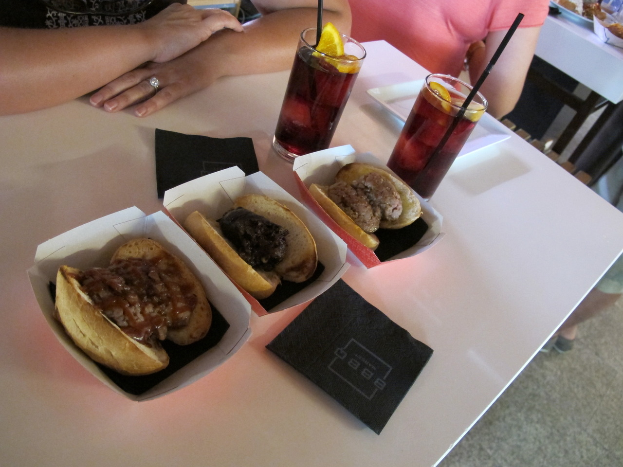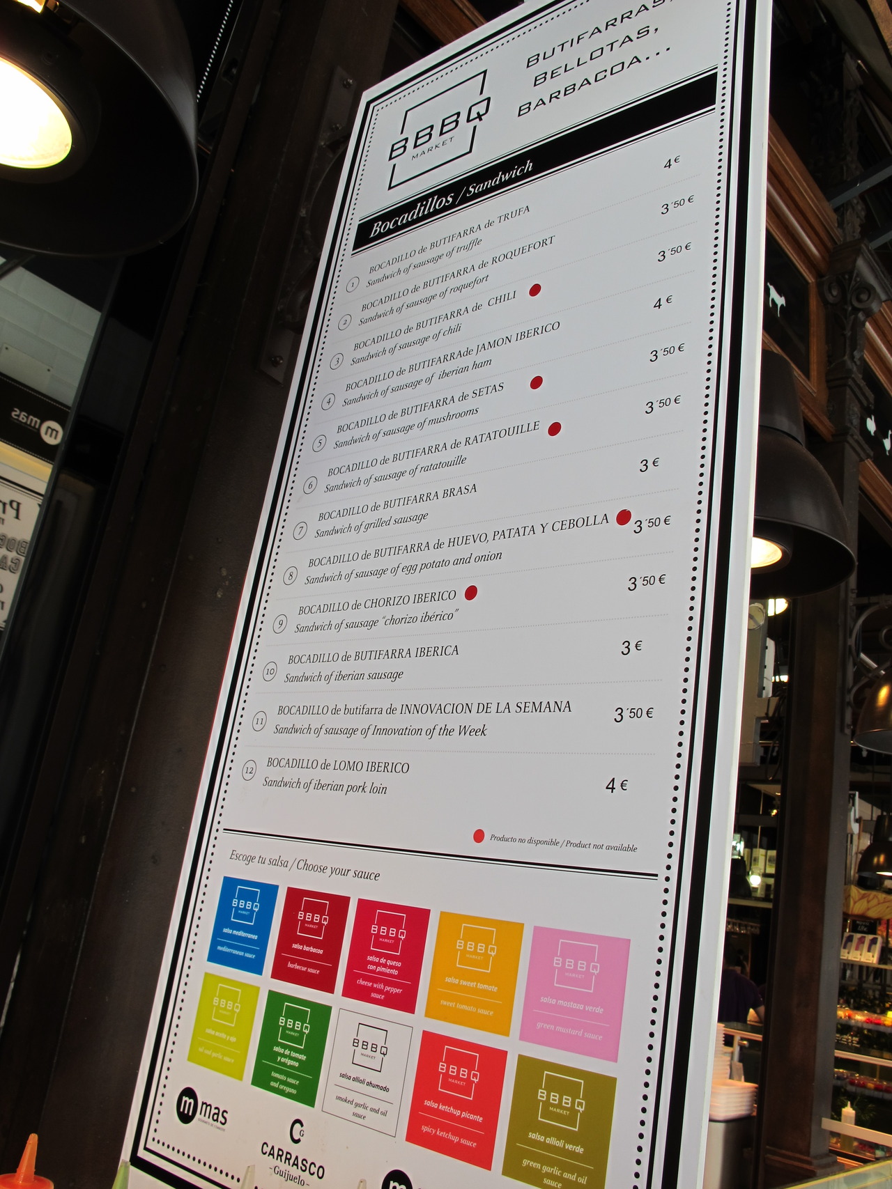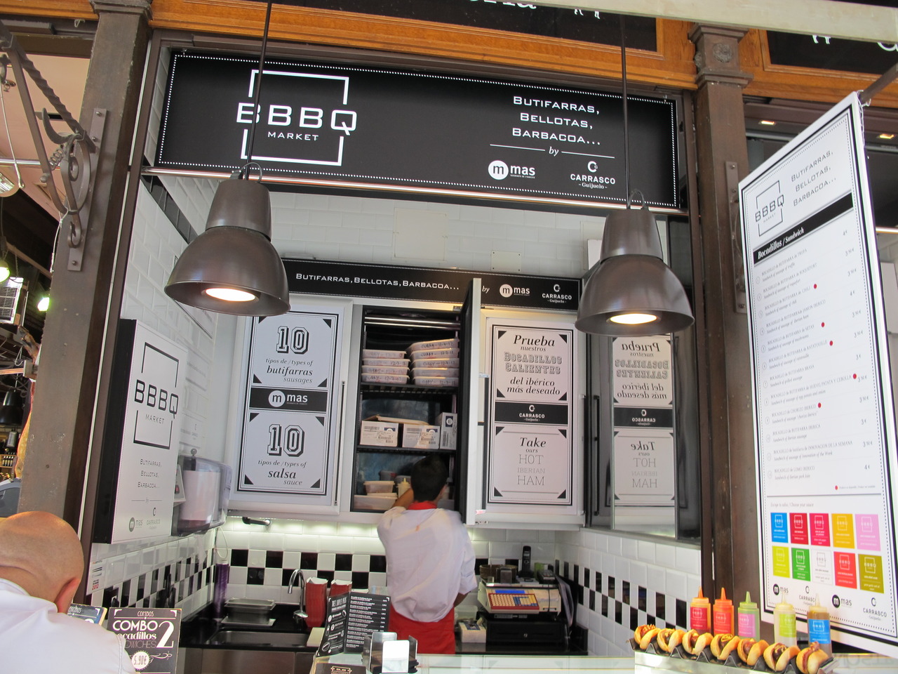 While in Spain earlier this month, I realized that while they do love their pig they primarily focus on cured hams, such as jamon iberico or jamon serrano. However, in the Mercado de San Miguel in Madrid Mrs. Monk and I stumbled upon a stand called “BBBQ Market” – with the three B’s standing for for butifarras (a type of Catalan sausage), bellotas (the finest type of jamon iberico), and barbacoa (the term from which “barbecue” originates, standing for cooking meat over an open flame). I can’t exactly recall which three sausages or sauces we picked, although I assure you we stayed away from the green mustard sauce (even in Spain, no mustard sauce!). However, I can tell you that the sausages were split and grilled alongside a bun (except for a particularly juicy type that wasn’t cut open while grilling) and we enjoyed them with some sangria in the market. Not the typical type of barbecue we blog about here, but just thought I’d share what Spaniards consider “barbecue” and how we escaped the heat for a short bit in Madrid.