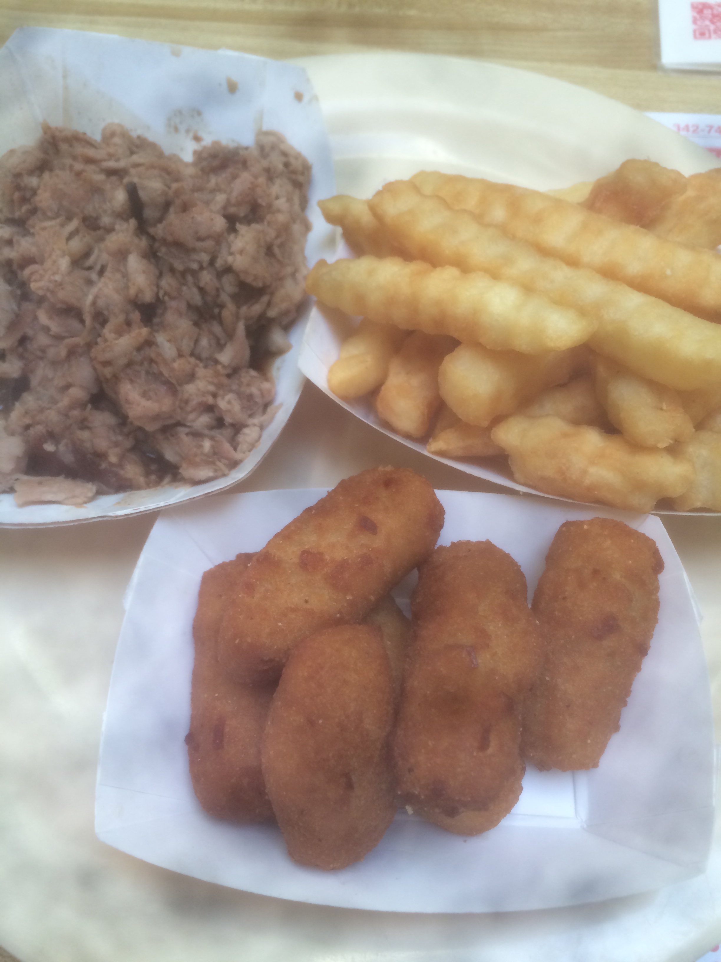 Speedy: Short Sugar’s is advertised as a drive-in, but in reality, it’s more like an old school diner. There are plenty of tables inside, as well as a lunch counter, and patrons are invited to seat themselves upon entry. Like a typical diner, the menu is fairly diverse, but there is a small section devoted to the barbecue. My order was easy – the barbecue tray with hushpuppies and slaw. When I found out from the waitress that they served white slaw, I quickly subbed in fries instead.