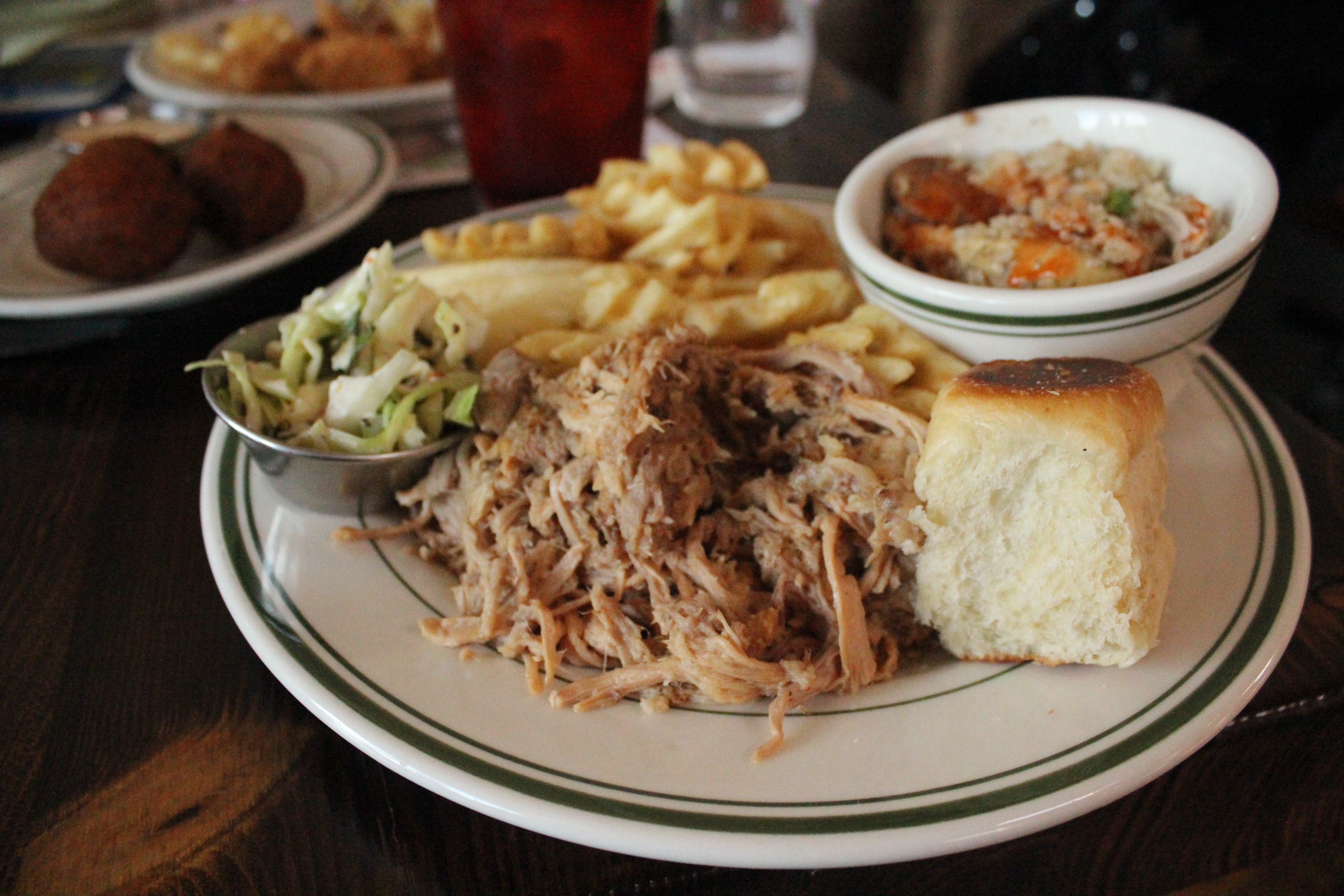 Order: Pulled whole hog barbecue plate with hush puppies appetizer and sides of chicken bog, waffle-cut fries; Cheerwine (link to menu)