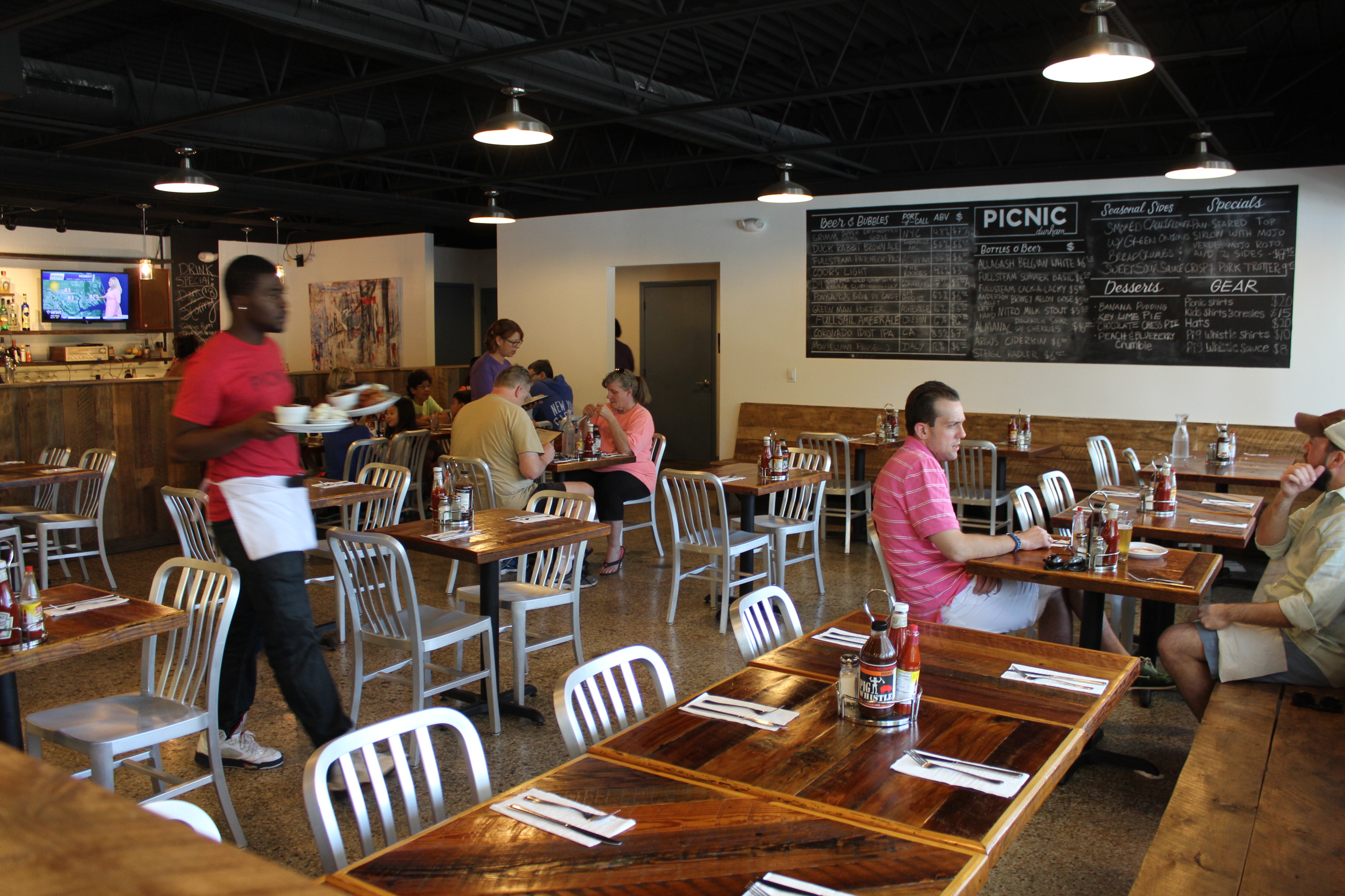 Picnic is located in a fairly picturesque setting amongst tall pine trees in a Durham neighborhood not far off of I-85. The building itself has an average sized dining room with a bar as well as 5-6 outdoor tables. An open kitchen overlooks the new south decor dining area, and the rattle of food preparation is audible but not distracting.