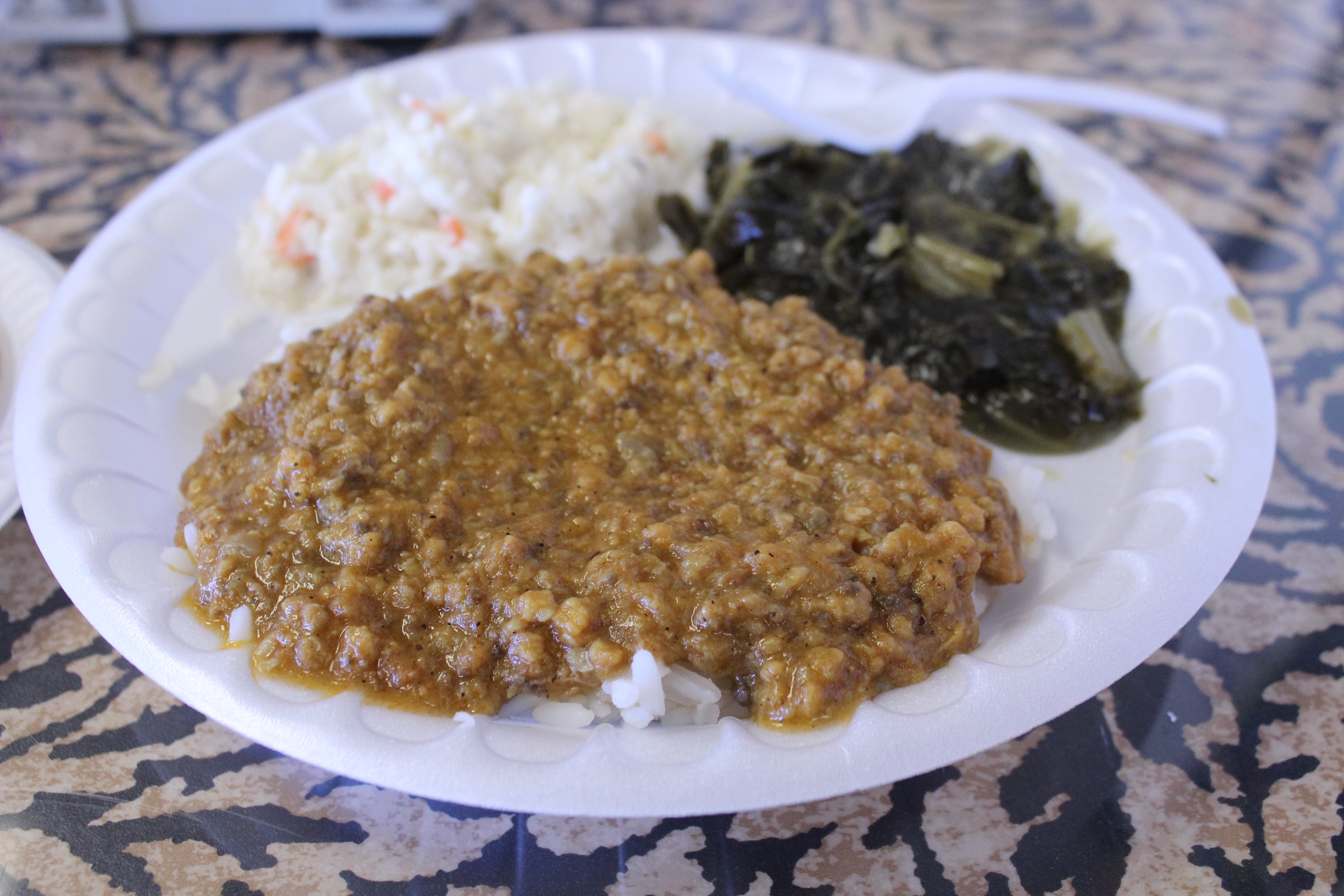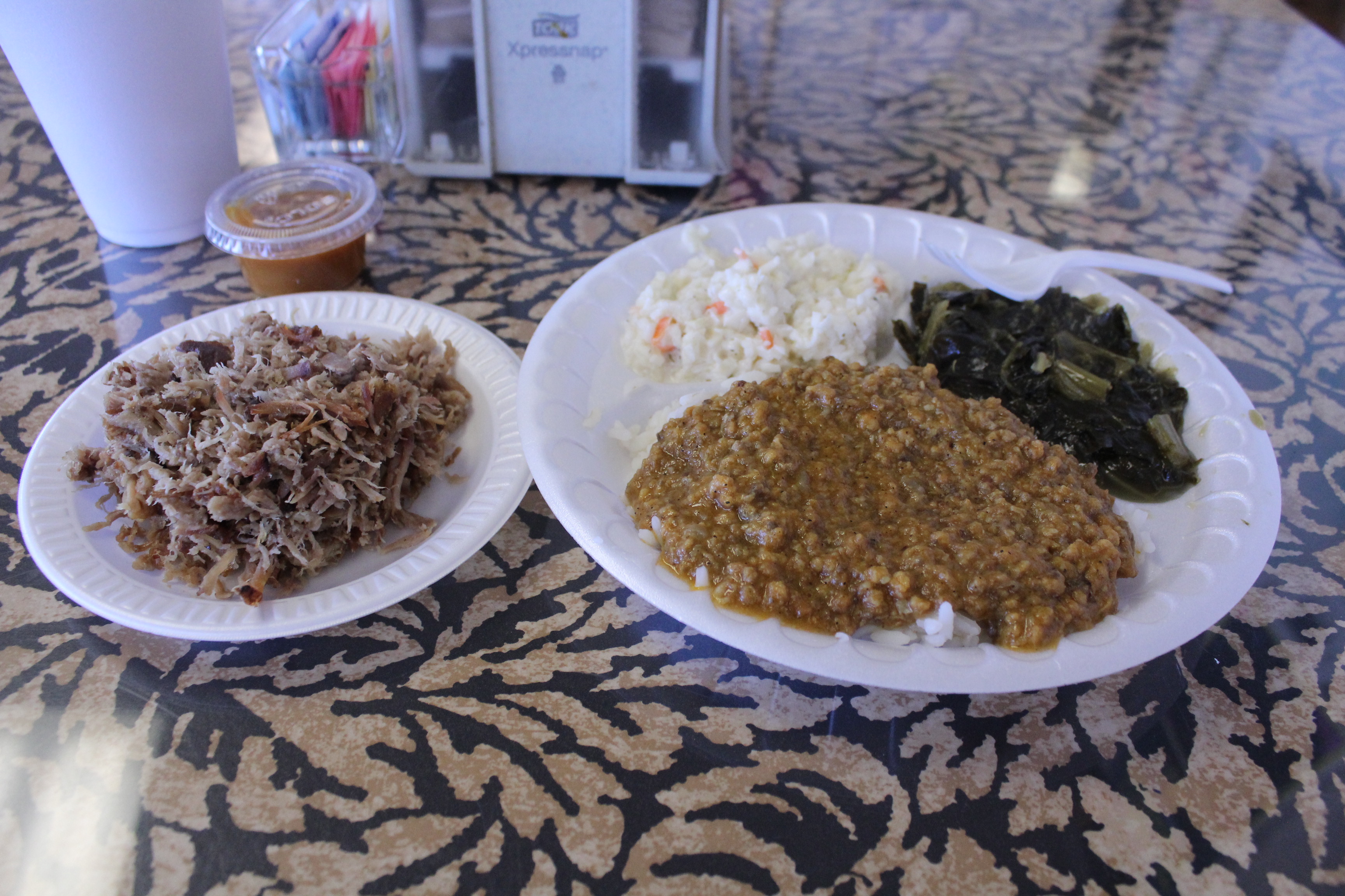 Order: Small barbecue dinner with hash and rice, collards, and slaw (link to menu)