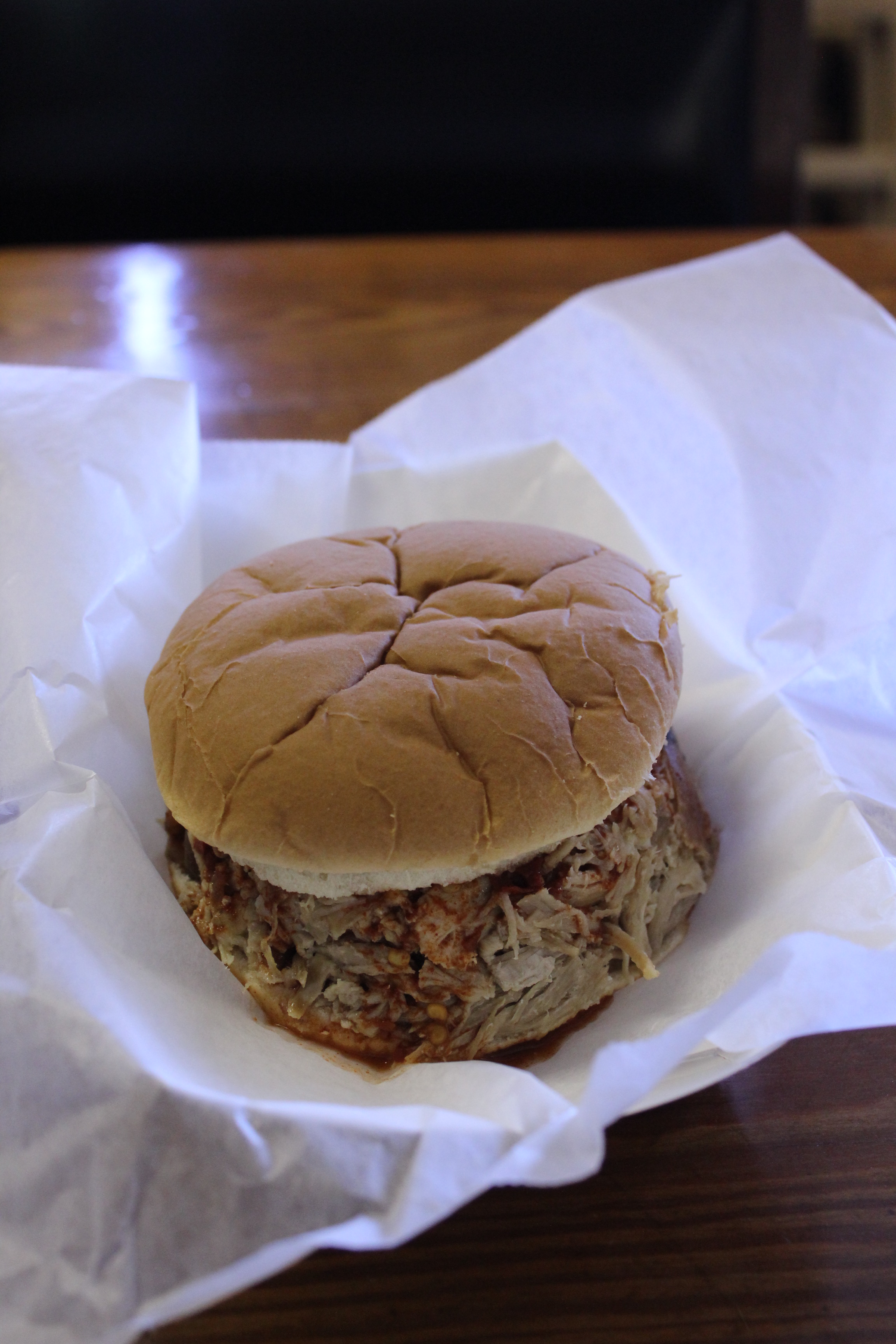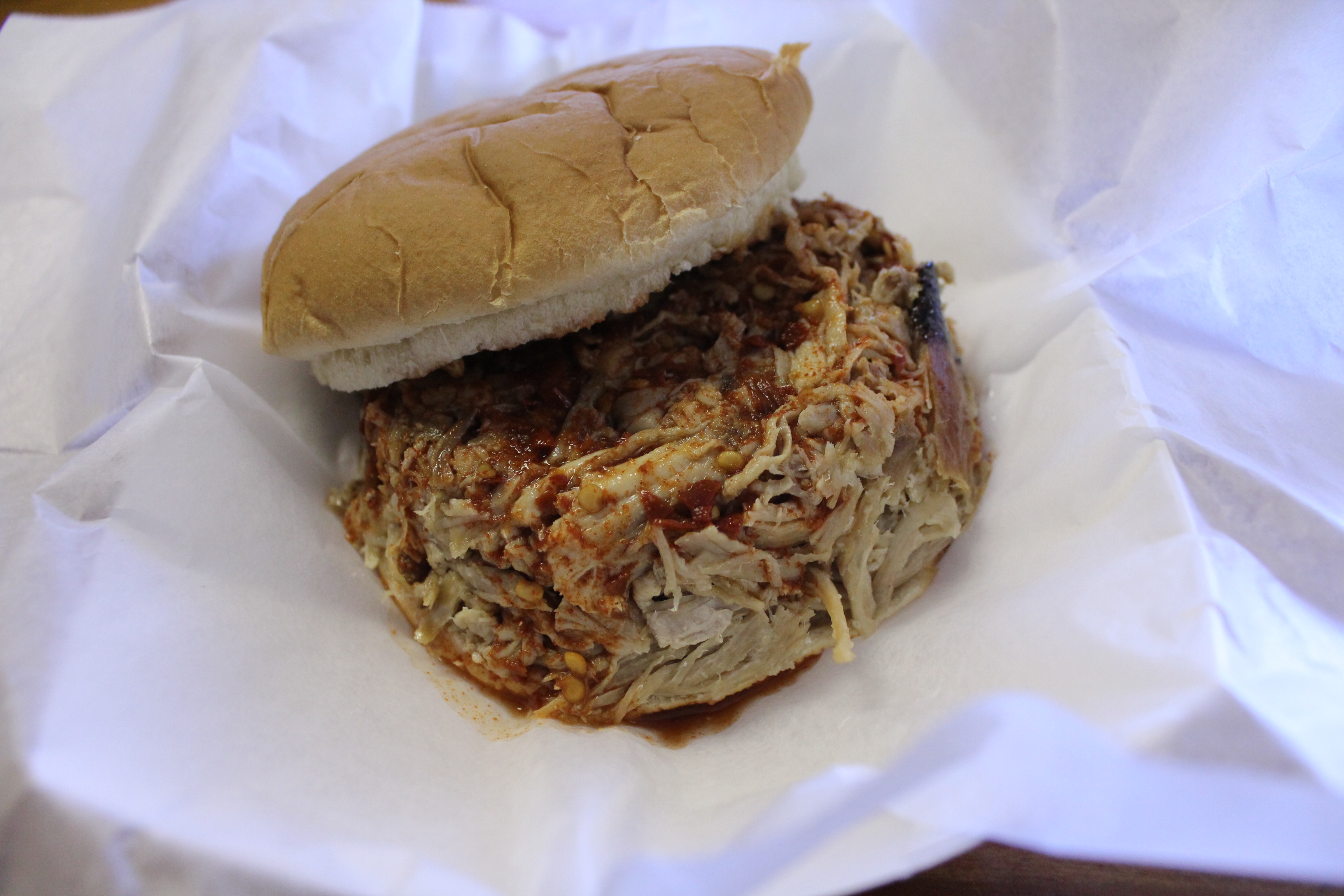 And what a huge sammie it was. In my haste I didn’t notice how well the pork was smoked or whether I could taste any wood smoke but my hunch is that the pork, though tender as it was, is heavily dependent on whichever sauce you choose. The spicy vinegar was indeed spicy; gotta say, I didn’t look twice at the Texas Pete on the table. And did I mention how big it was? It was a good sandwich overall, albeit a little on the pricey side.