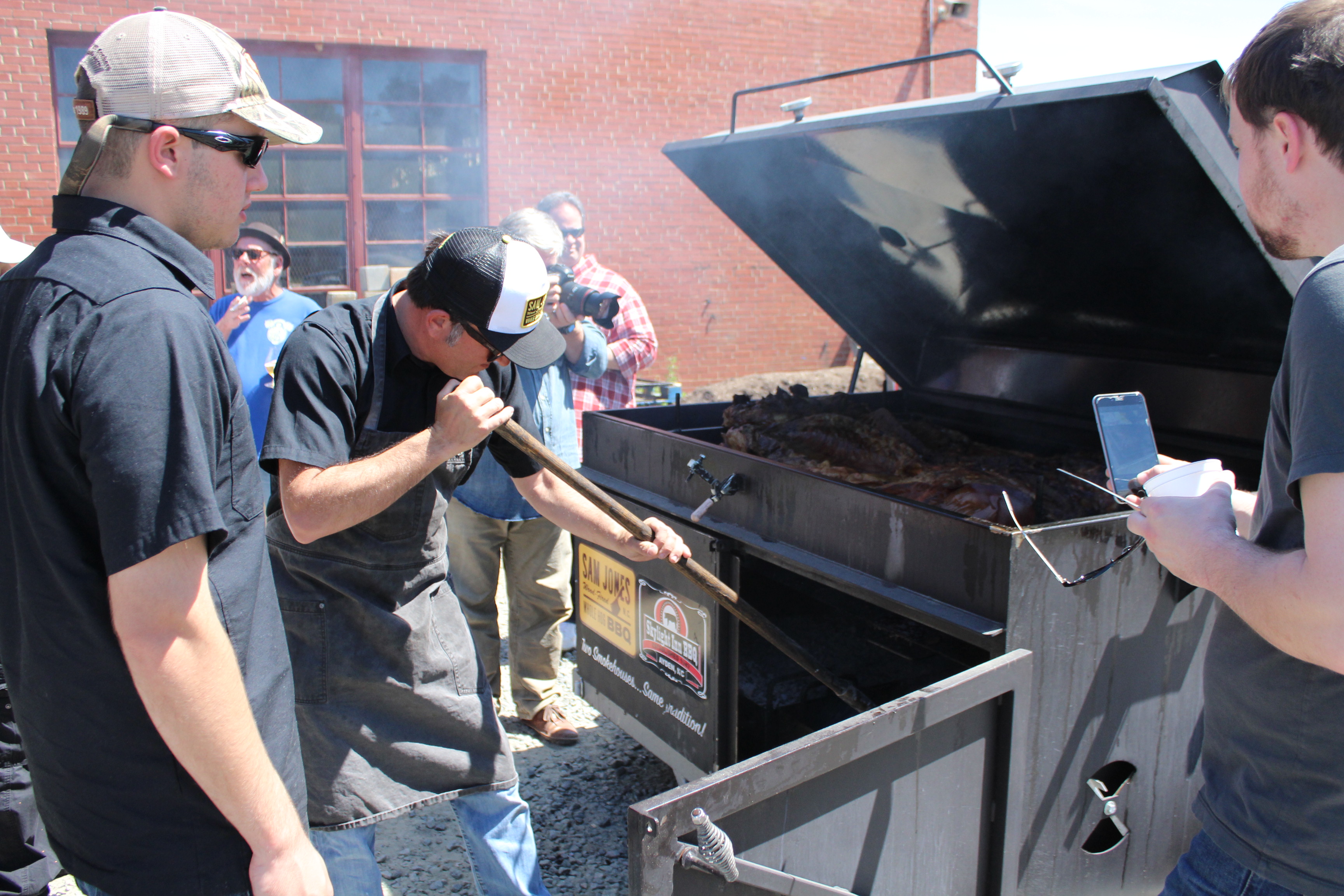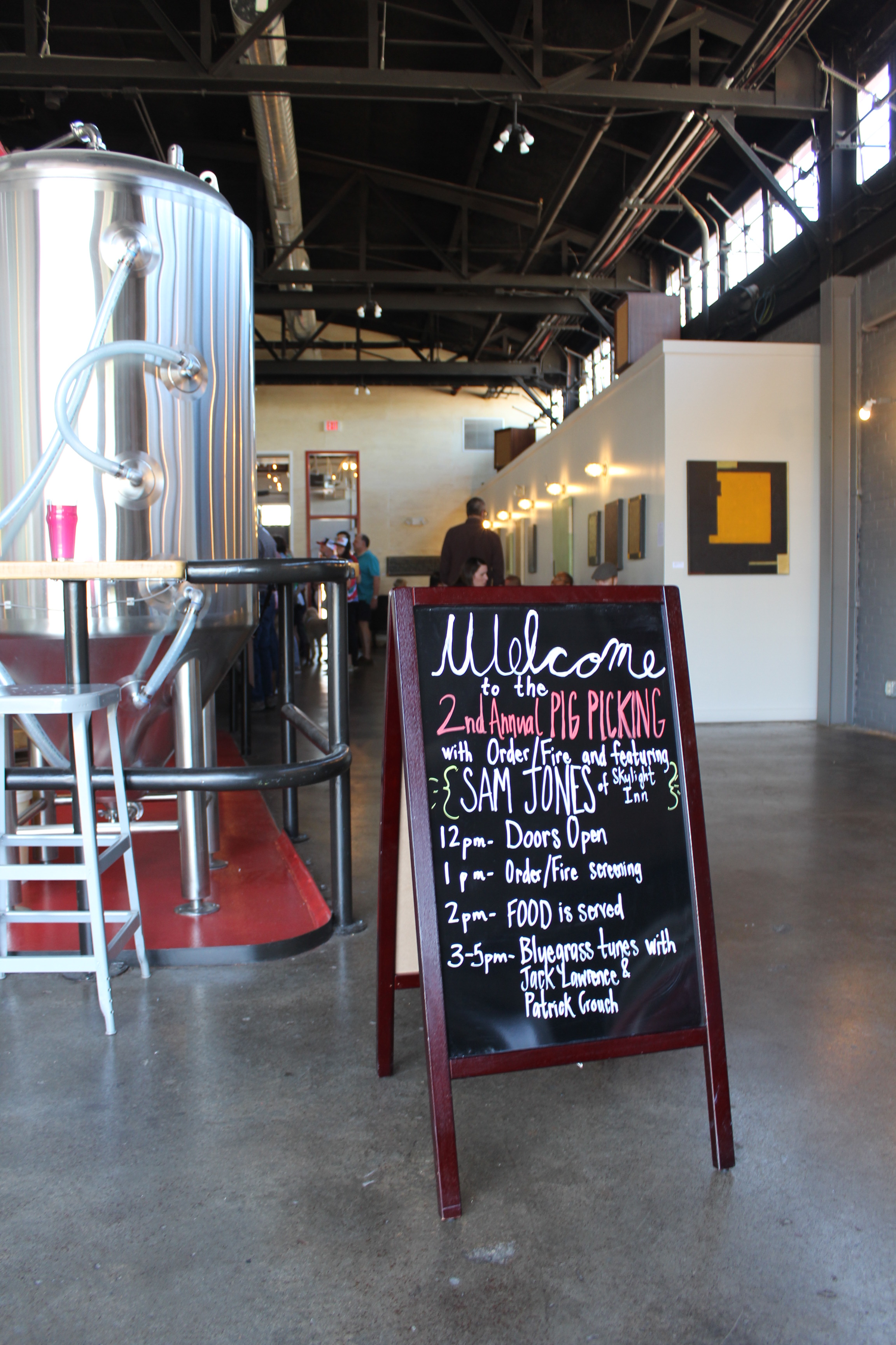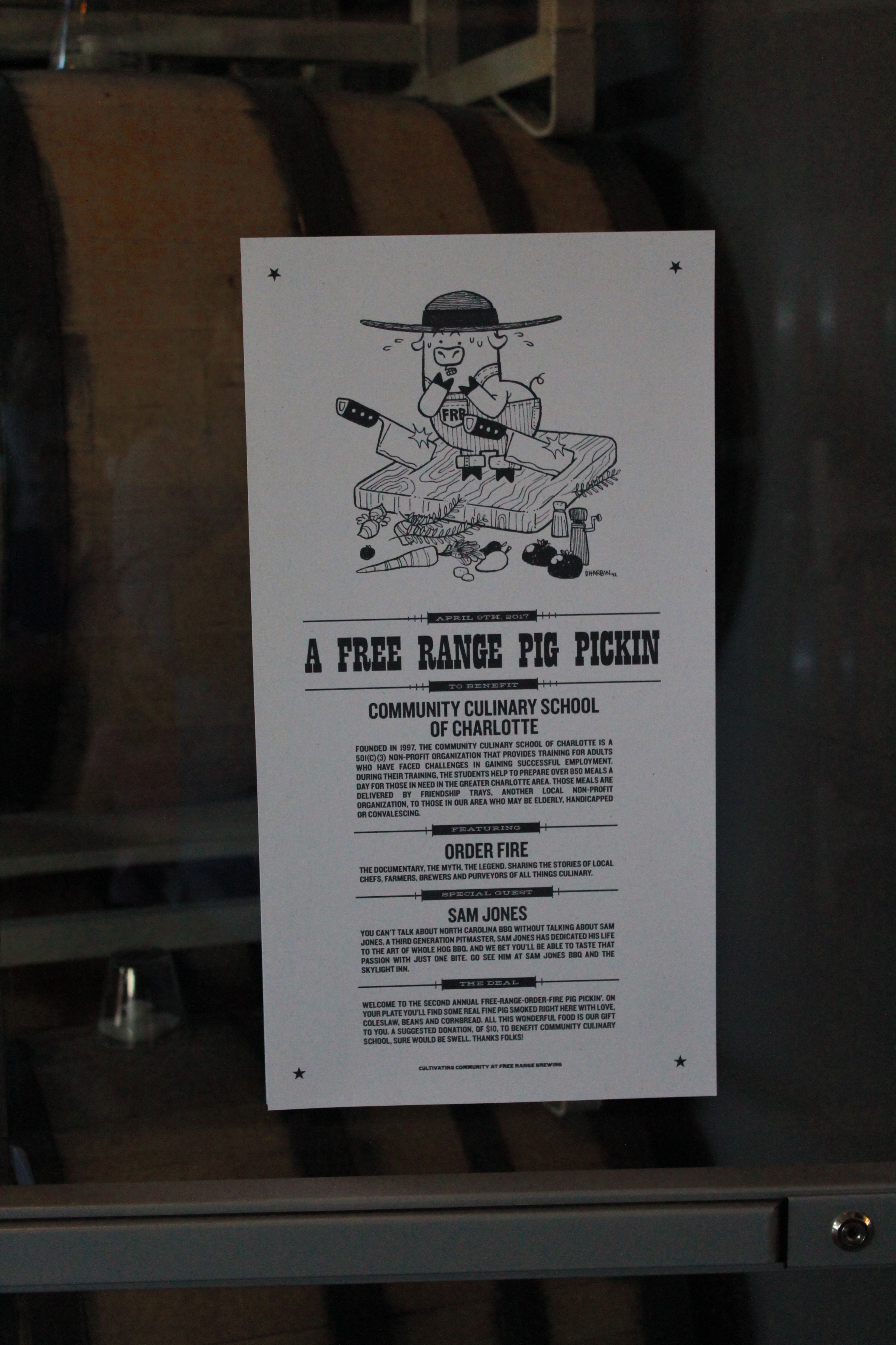 For the second year running, Free Range Brewing and Order/Fire combined powers to host a premiere screening of an episode of the web series with a pig pickin’ to follow. While last year’s episode featured four NC breweries (Burial Beer Co., Fonta Flora Brewery, Fullsteam Brewery, and Free Range Brewing), this year’s episode was on Sam Jones and Skylight Inn. Sam joined the festivities and smoked a 230 pound hog the night before for the pig pickin’. The whole shindig and its $10 suggested donation for the barbecue benefited the Community Culinary School of Charlotte, so there was an abundance of reasons to make it out to Free Range on a Sunday afternoon.