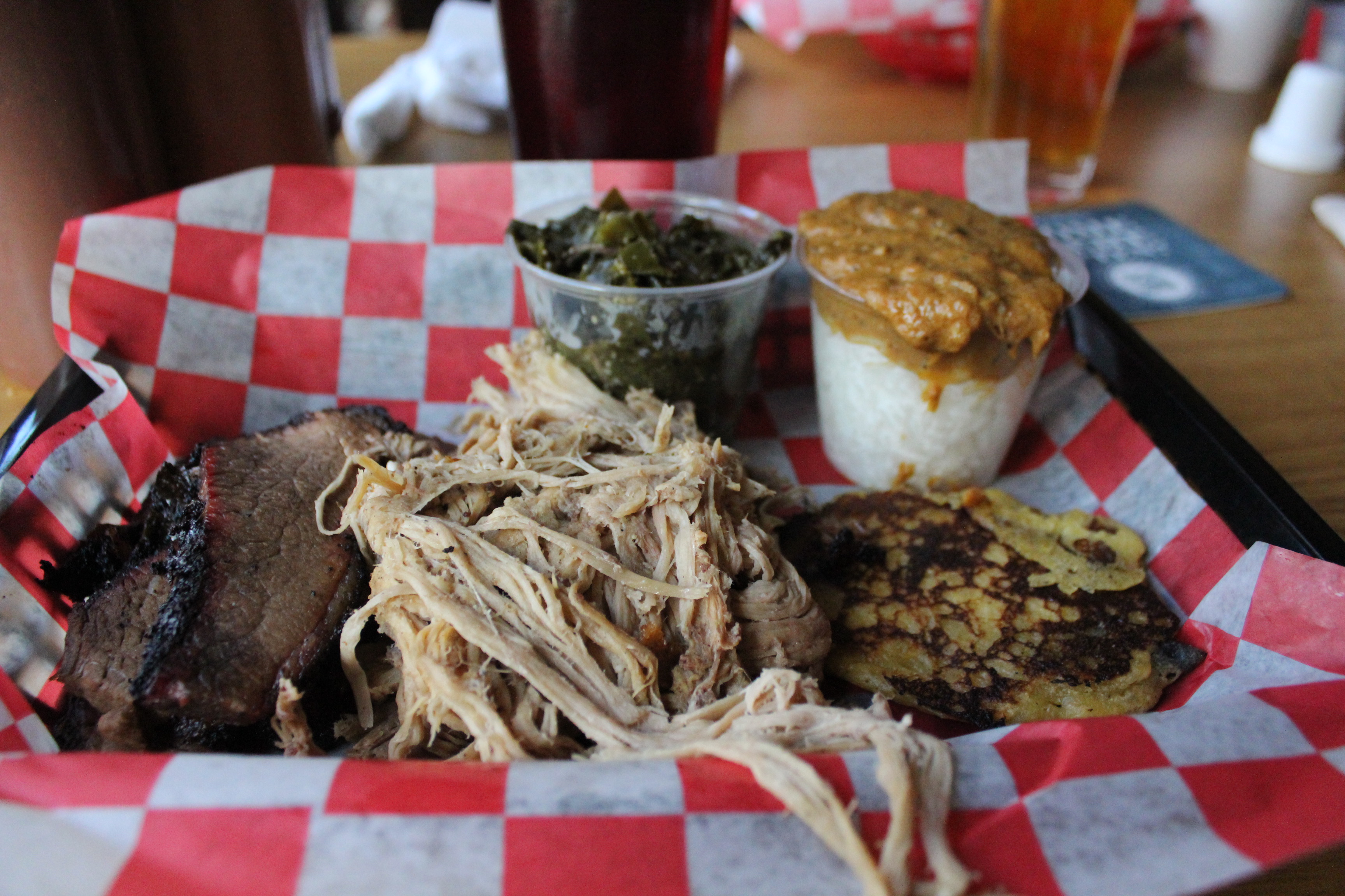 Order: Two meat plate (brisket and pulled pork) with hash and rice, collard greens, and cracklin’ cornbread (link to menu)