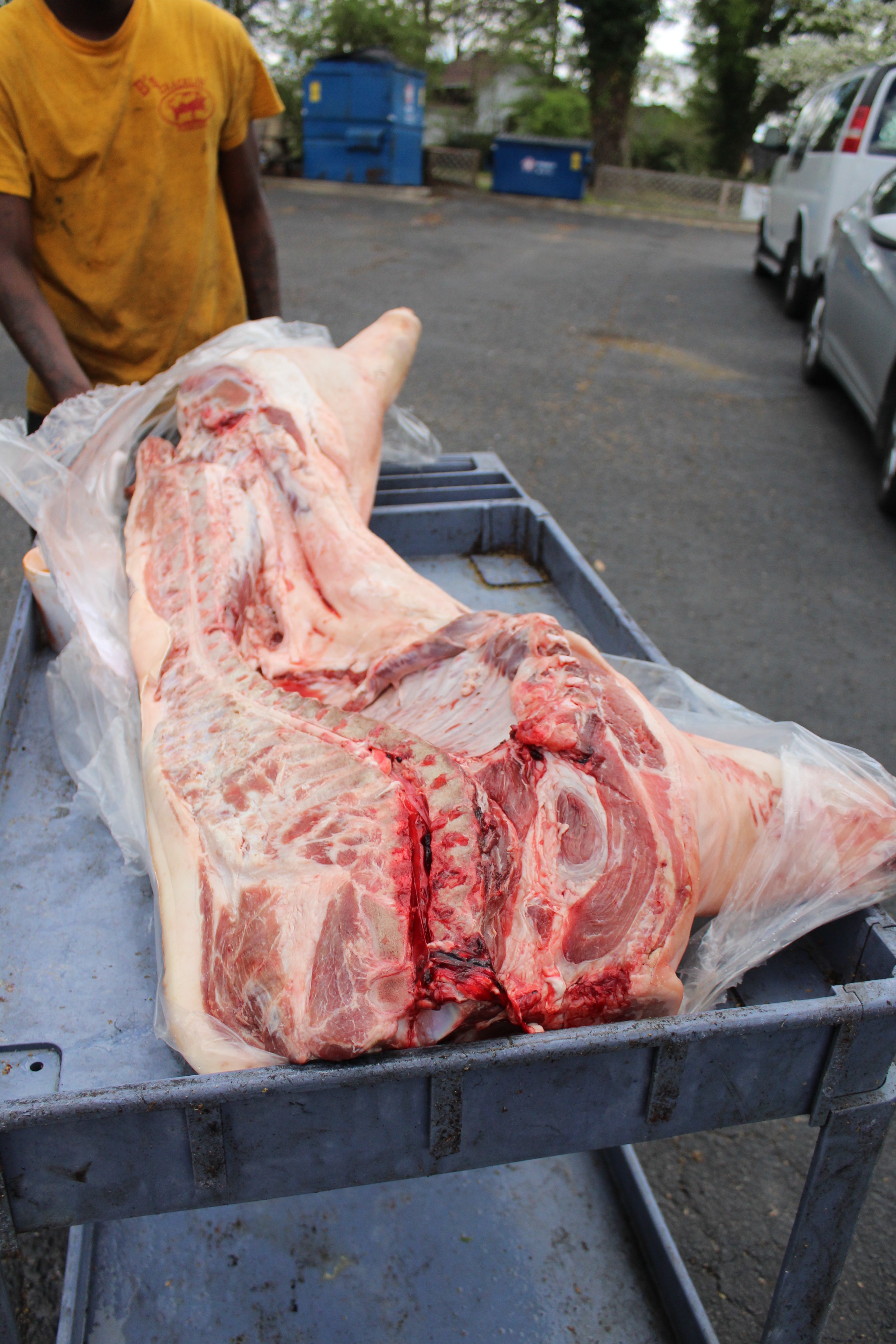 The whole hog pork at B’s is smoked from heritage hogs and was definitely the star of the show. It was served in coarsely pulled strands reminiscent of Scott’s Bar-B-Cue and was just downright excellent. Unlike Speedy’s visit, mine wasn’t on the dry side and each strand had a nice silky texture. I tried both the spicy vinegar and peach mustard sauces and while neither was essential, both complemented the pork well. Speaking of the pork, on our way out to the car, I even caught a worker carting a half of one of those heritage hogs from their annex to the main building, so I took the opportunity to snap a few photos.
