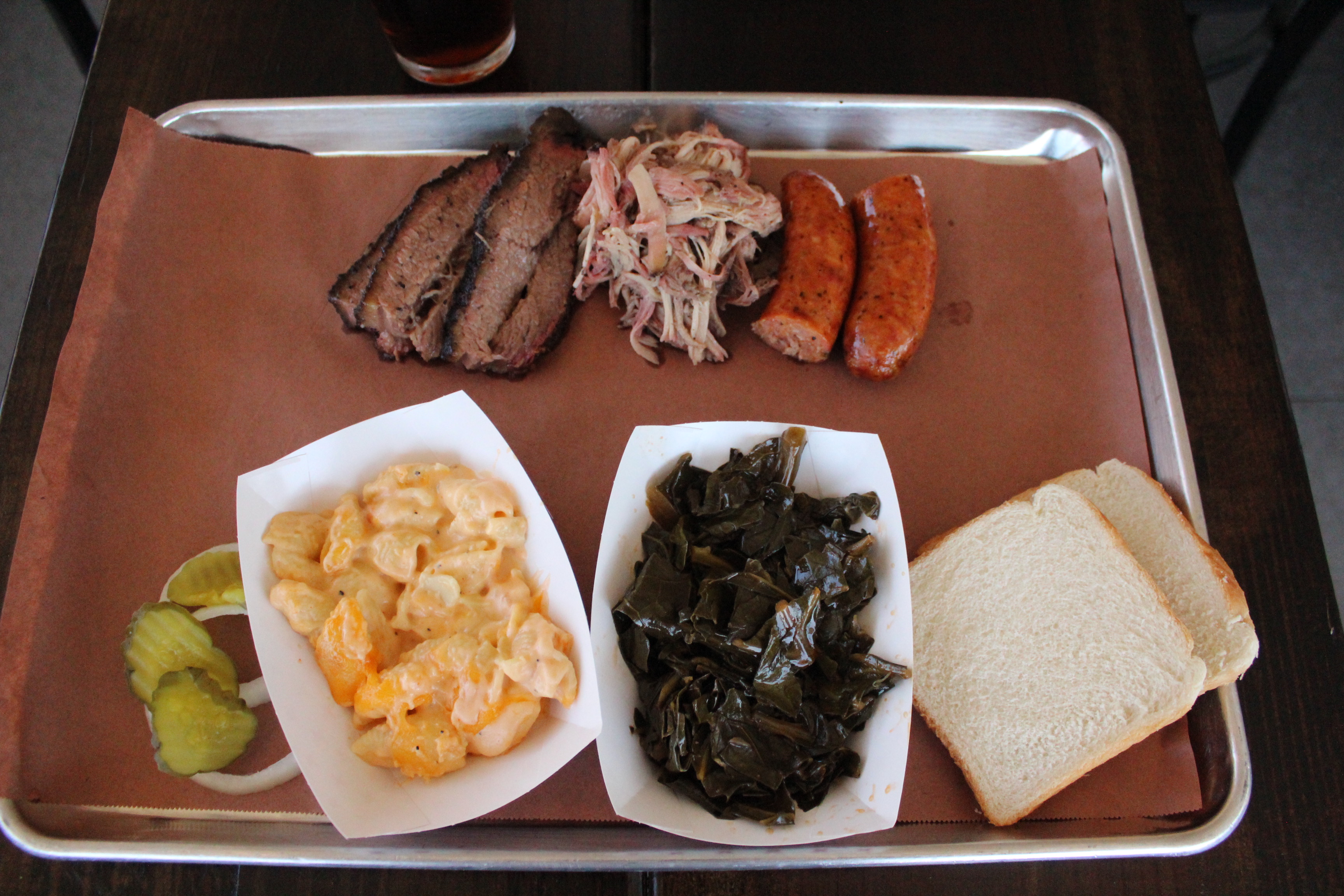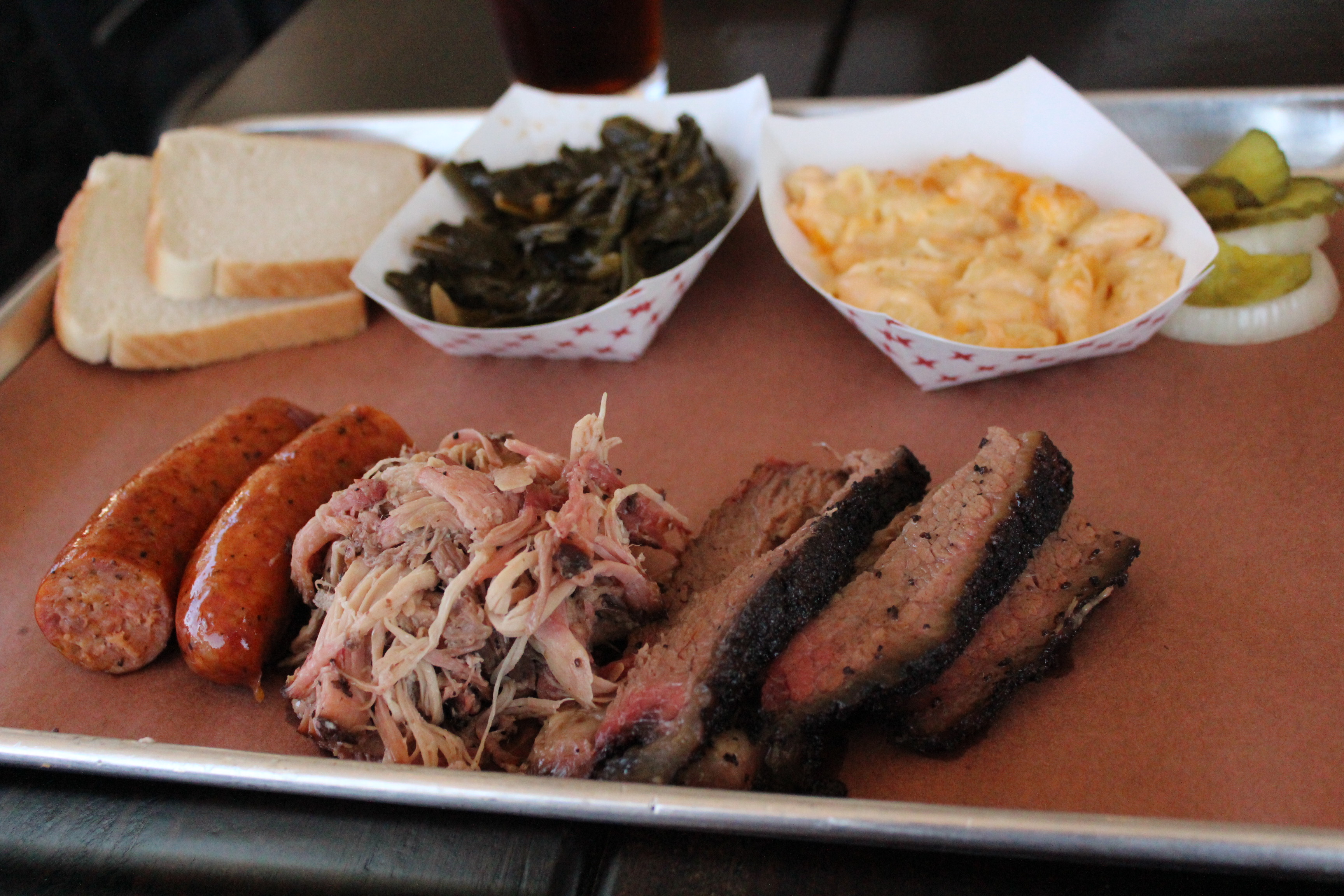 Order: Triple meat plate (pulled pork, brisket, and sausage) with mac and cheese and collard greens (link to menu)