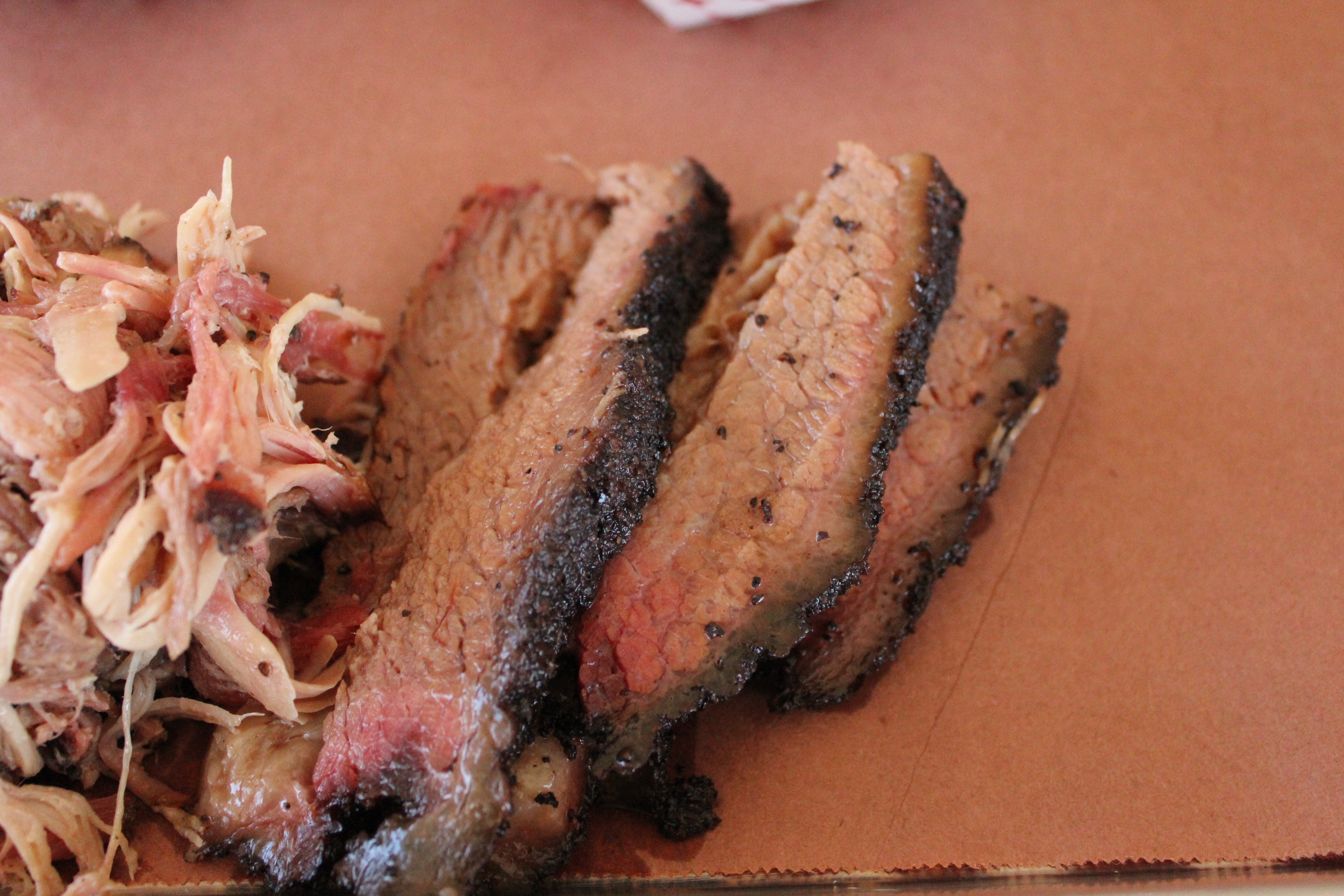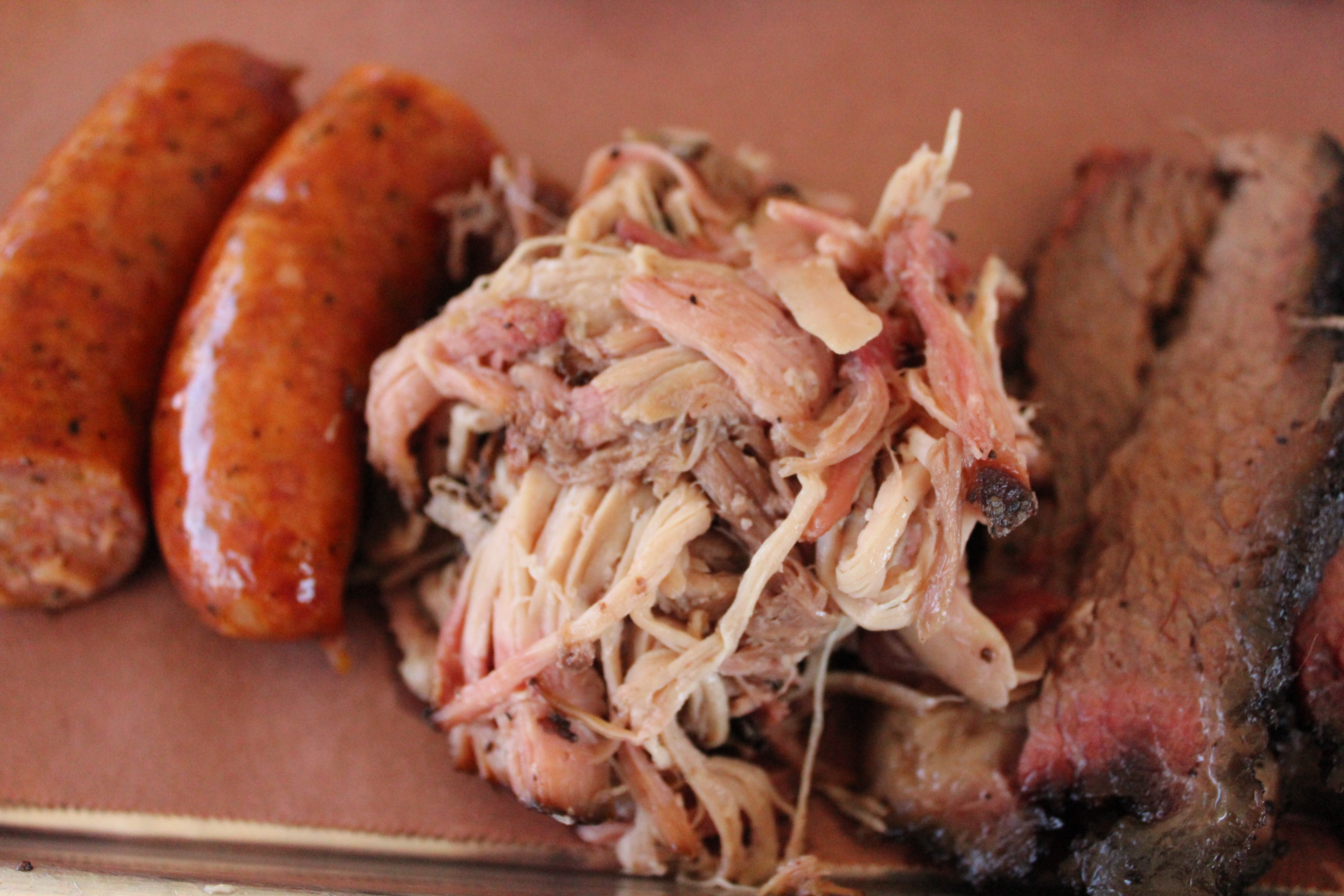 I ordered the triple meat plate of pulled pork, brisket, and sausage. I’ll start with the sausage, the meat which allowed me to try the joint in the first place. Das BBQ imports two types of beef links from Meyer’s Smokehouse in Elgin, Texas – spicy and mild. We tried the spicy and it had a nice peppery kick. The case had a good snap and it was a well-smoked sausage. We tried the table side peach mustard sauce and it was a nice fusion of Texas-meets-Georgia.
