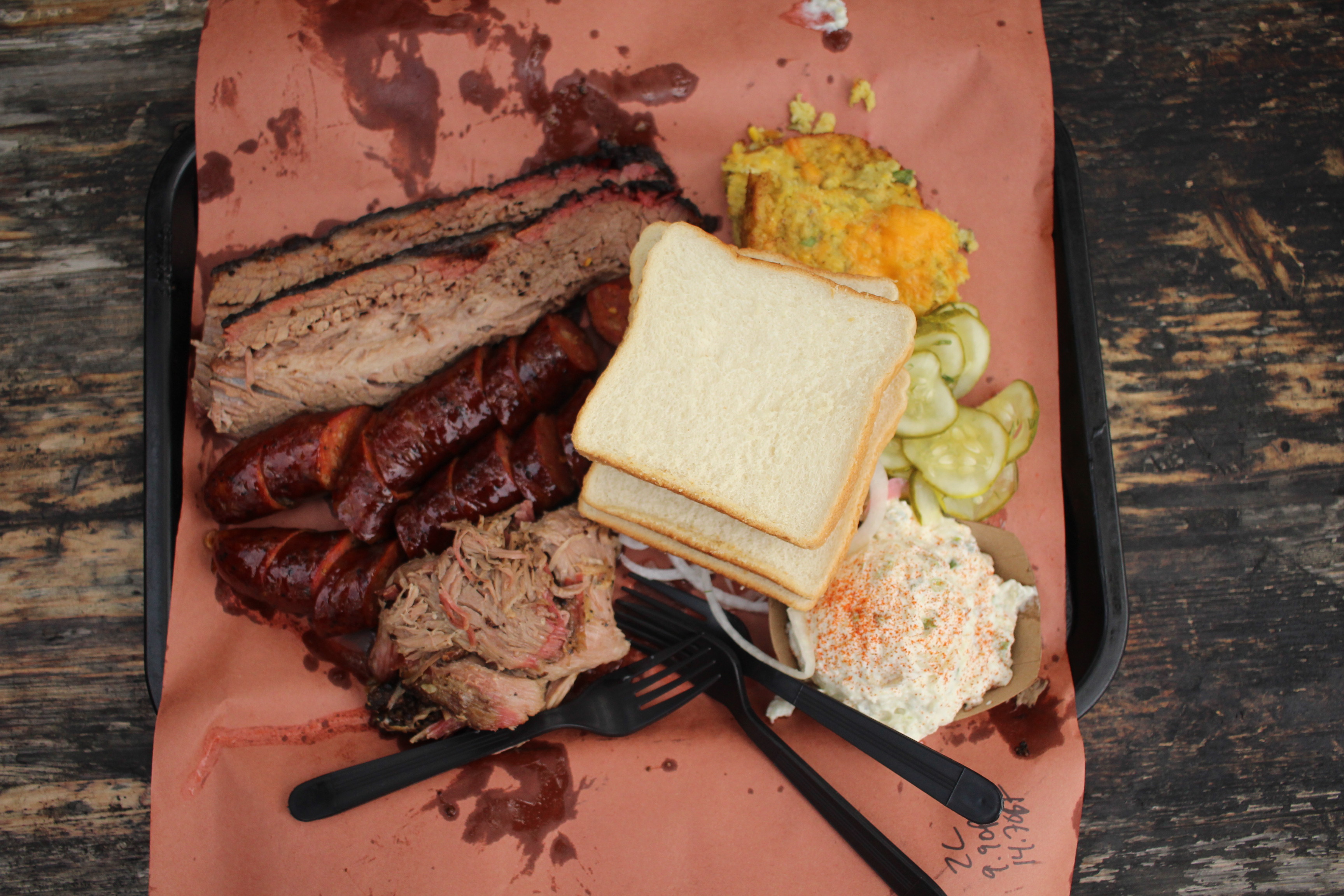 Order: ½ lb pork, 2 slices of brisket, 2 links Texas hot guts, corn pudding, potato salad (link to menu)