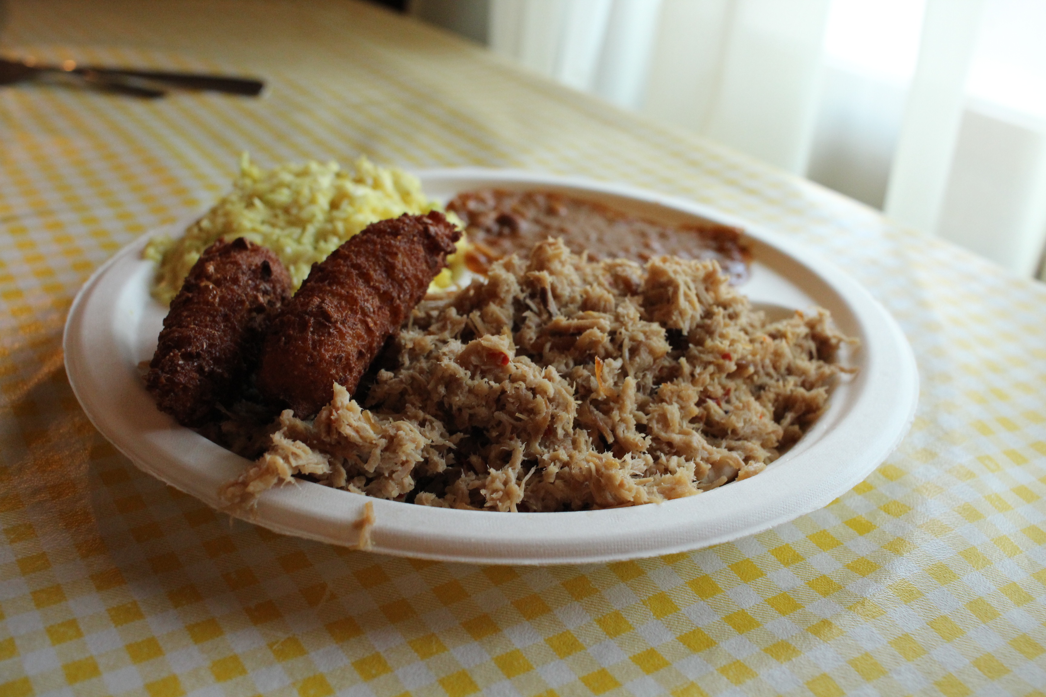 The hush puppy basket was late in arriving, coming after our plates had come. But that likely saved me from overeating on the delicious, slightly-sweet cornmeal pups. I have come to appreciate the mustard-based slaw, even if it will never be my favorite style. And the beans were fine.