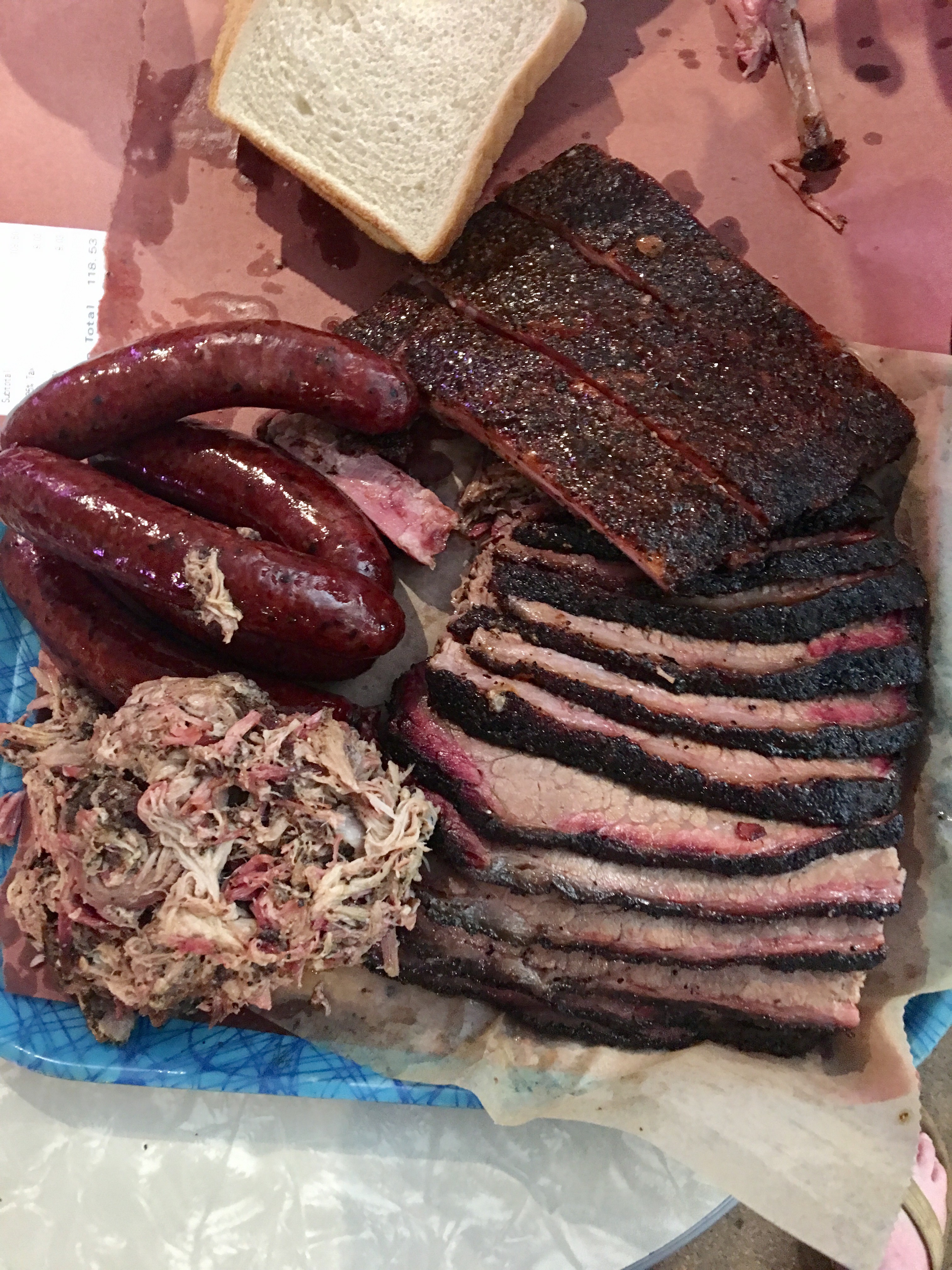 Order: 2 pounds brisket, 1 pound ribs, 1 pound ribs, 1 pound sausage (link to menu)