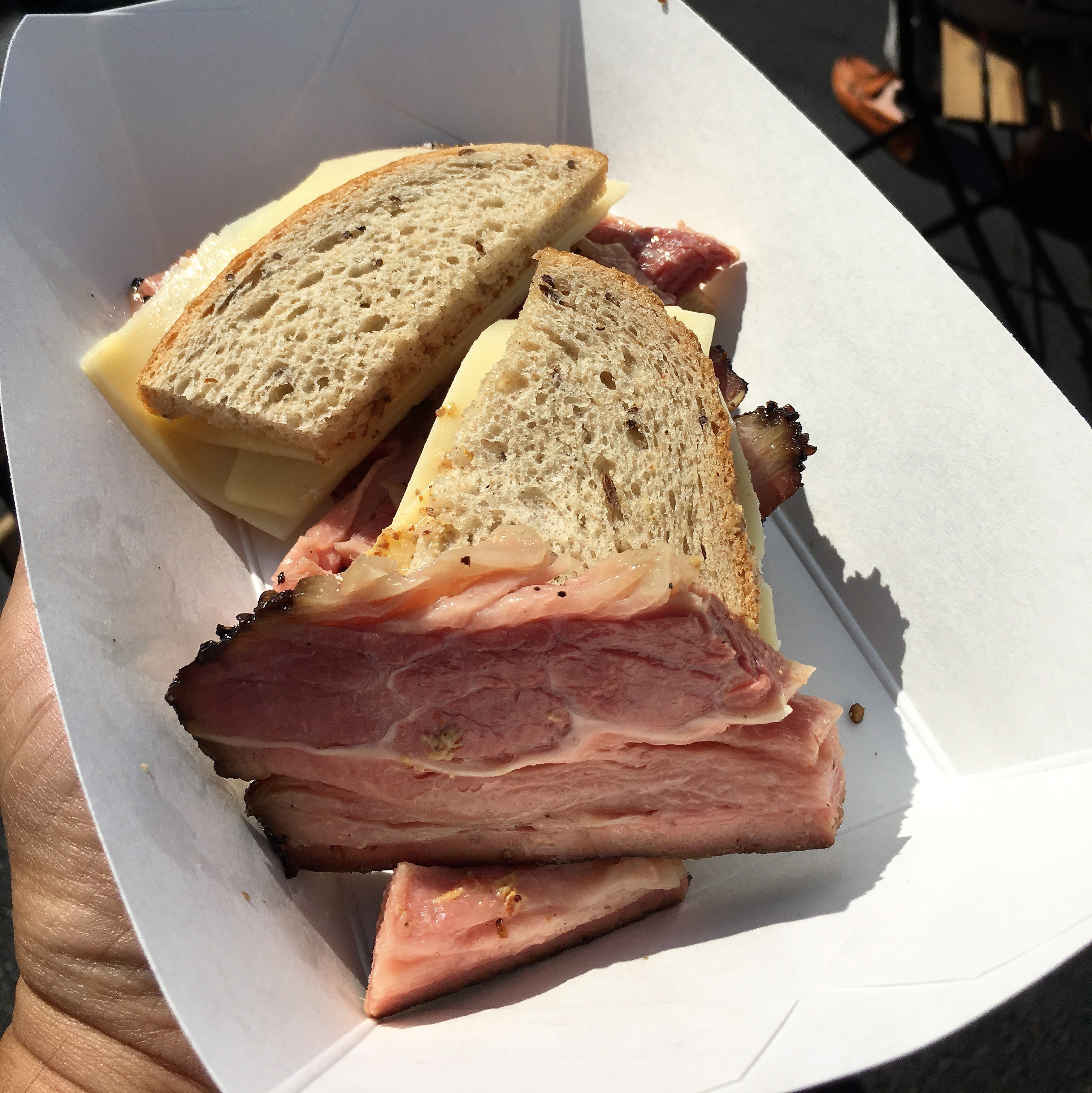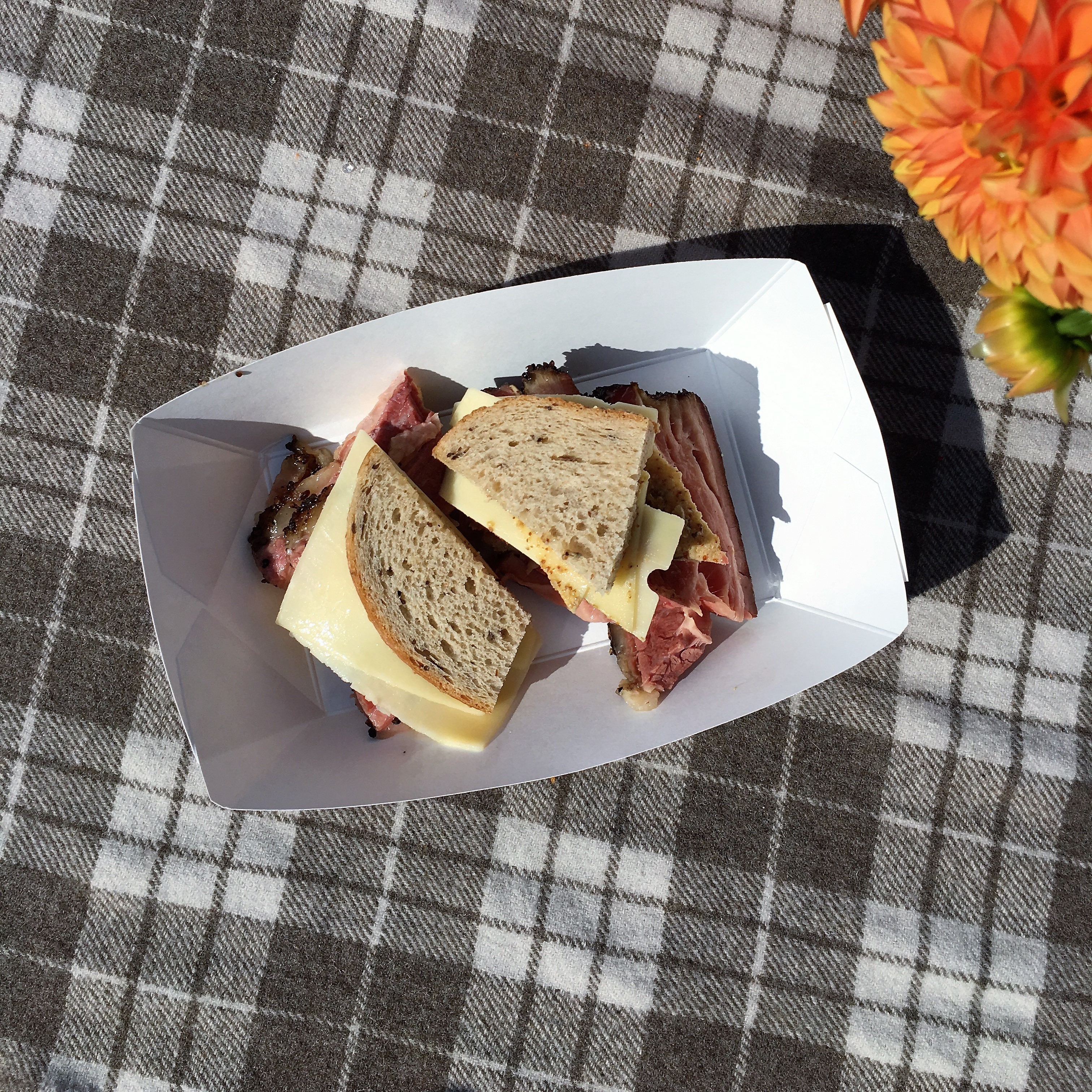 Monk: For the second year in a row, Jim Noble of the forthcoming Noble Smoke partnered with local menswear store Tabor for their Bungalow Social block party, While last year he smoked NC-style barbecue, this year he brought house made hot dogs grilled out of one of his mobile rigs, Flossie. So while I have still yet to try Noble’s barbecue, the hot dogs ground and made in-house at his uptown Rooster’s location more than hit the spot on a sunny fall day. I went Carolina style with chili, slaw, and mustard before topping it off with Texas Pete. Additionally, in an off-menu item, Jim had also smoked a pastrami and when I asked for a small taste he graciously offered a full sandwich. I’m no pastrami connoisseur but it was just fantastic.