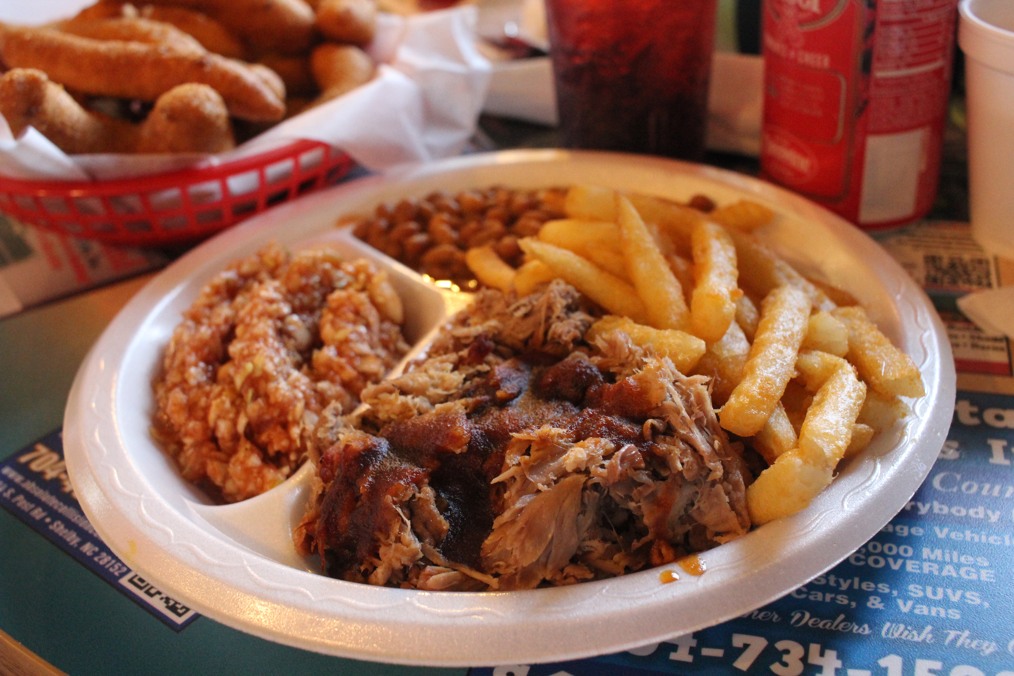 Order: Barbecue plate with red slaw, hush puppies, fries, and baked beans, Cheerwine (link to menu)