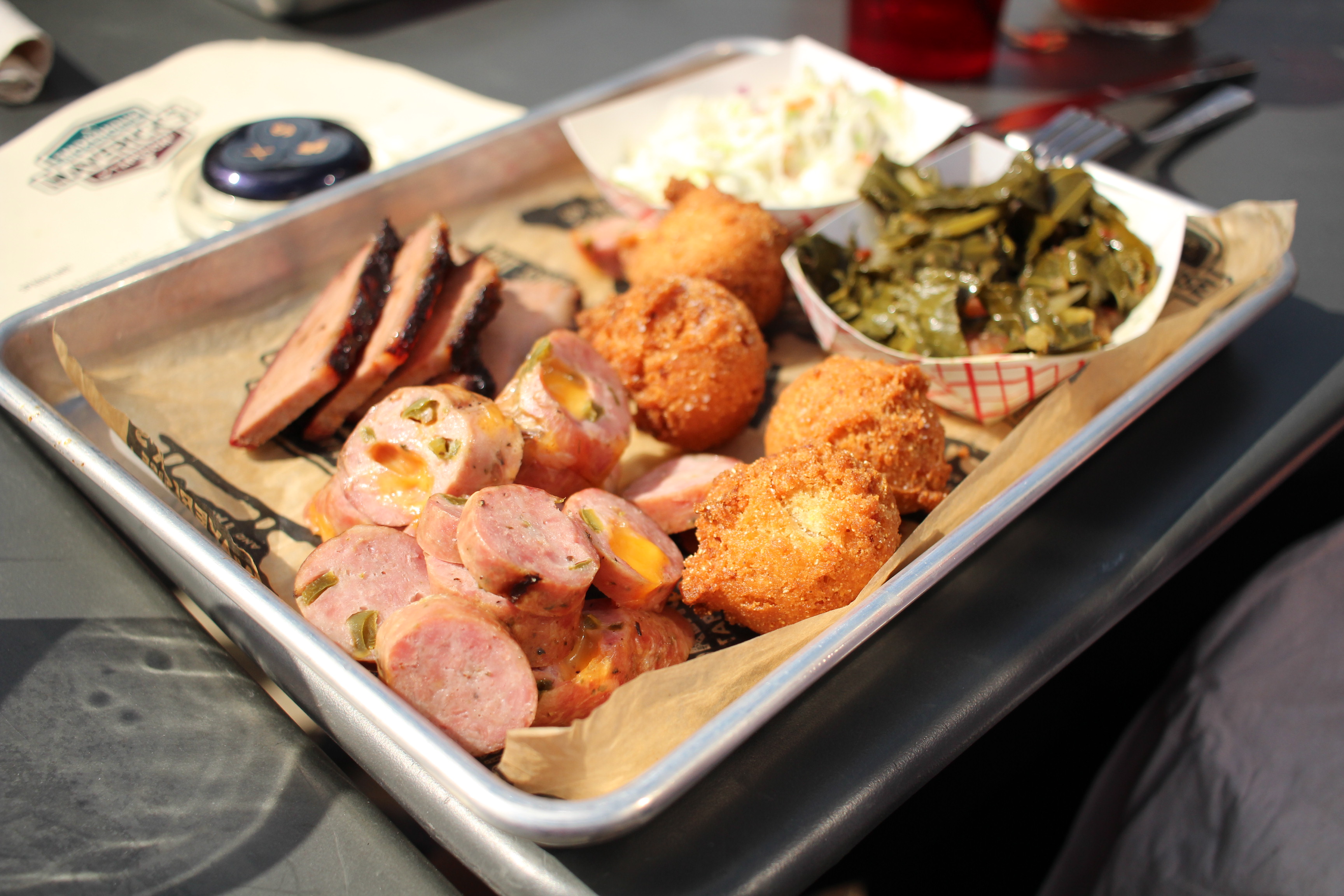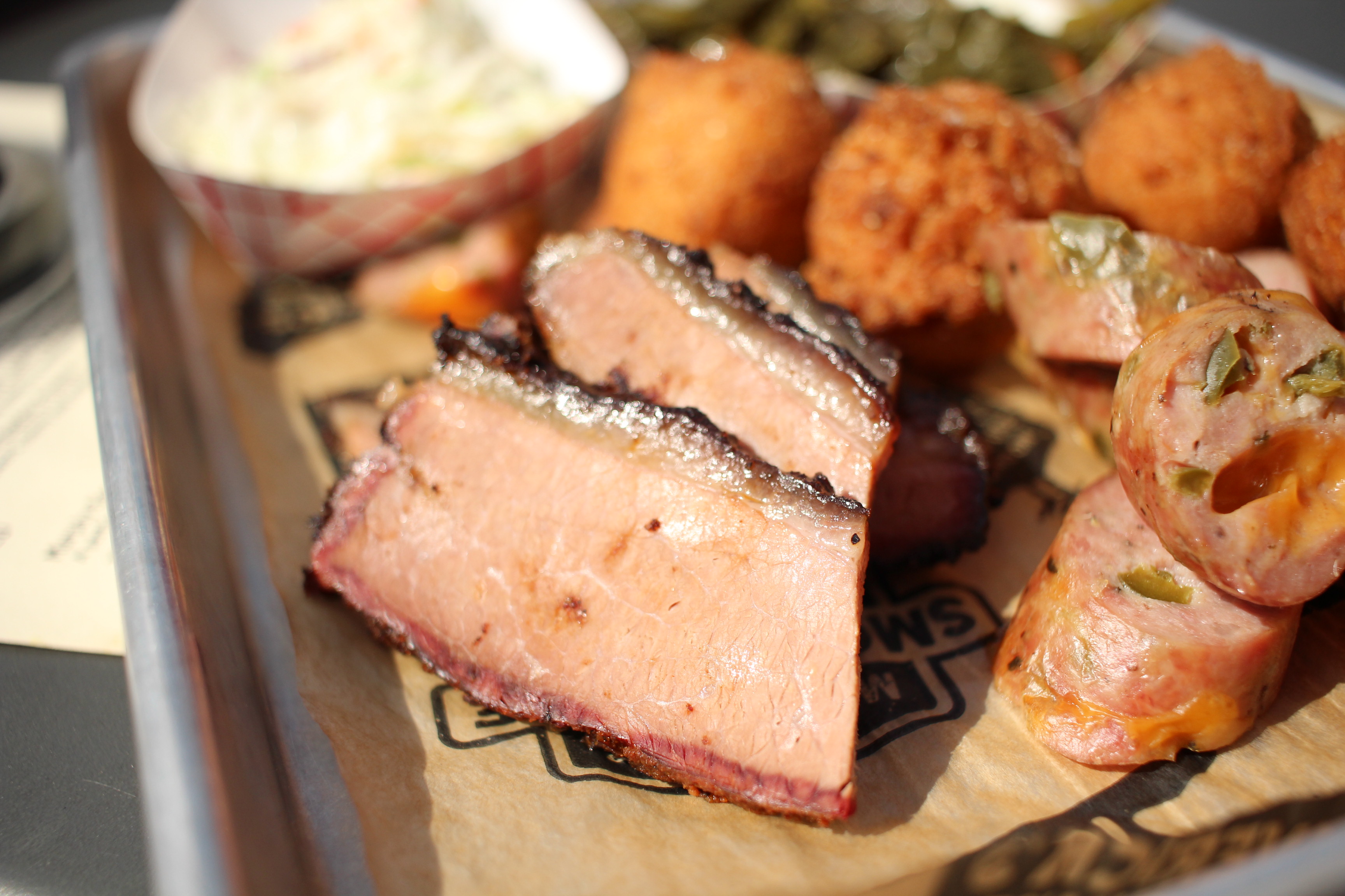 Order: 2 meat combo with brisket and smoked jalapeno cheddar sausage with hush puppies, collards, and cole slaw (link to menu)