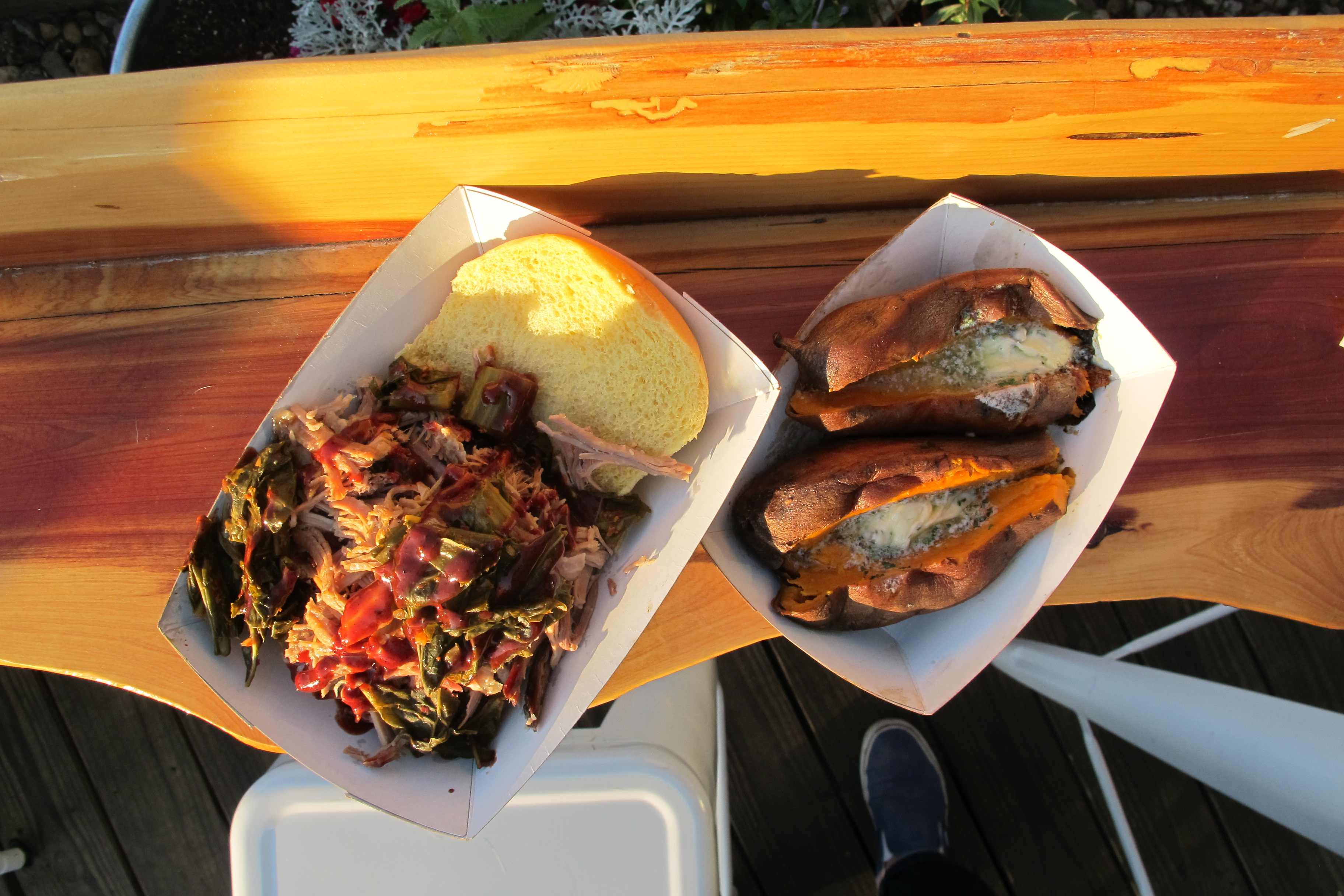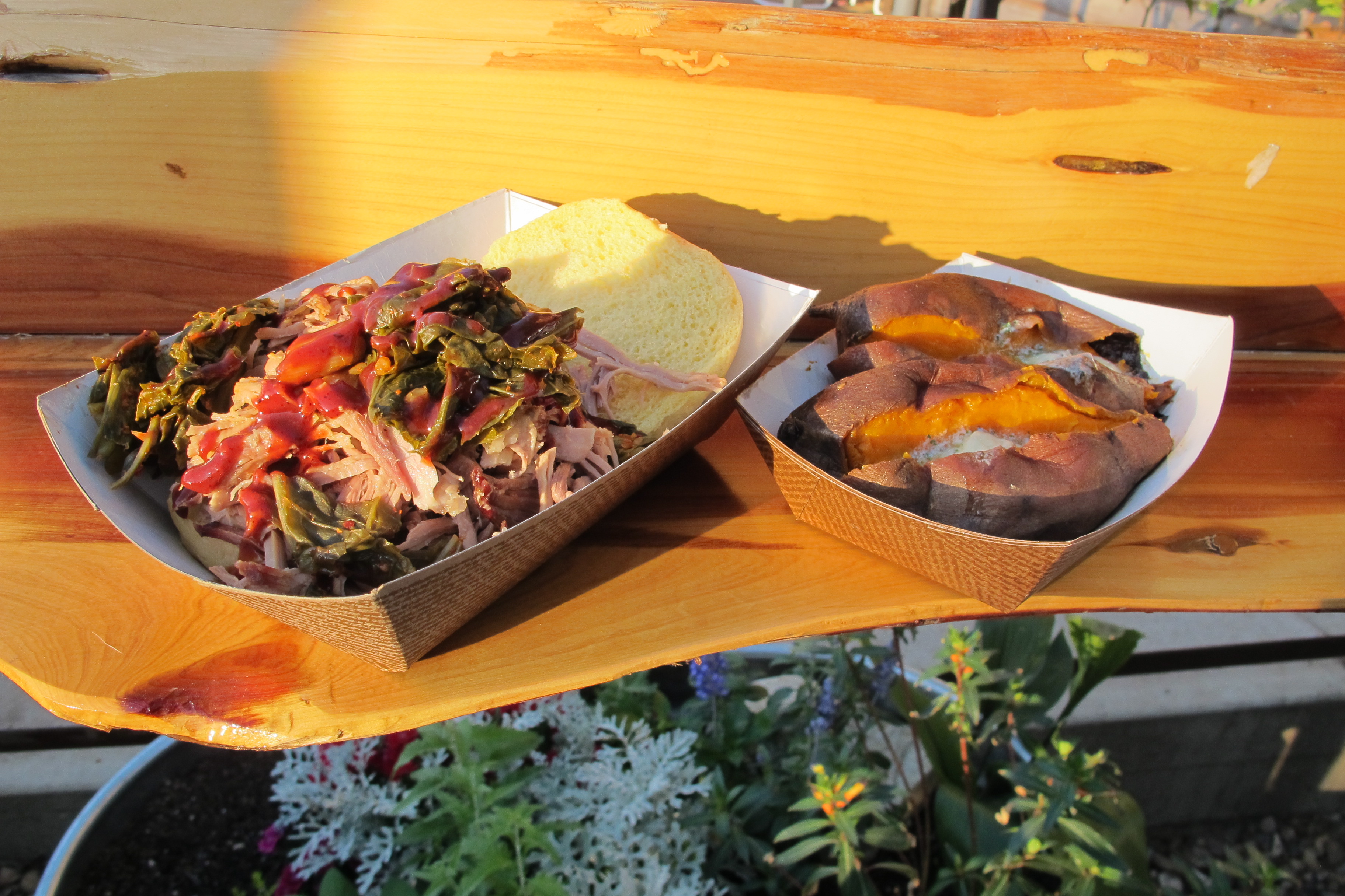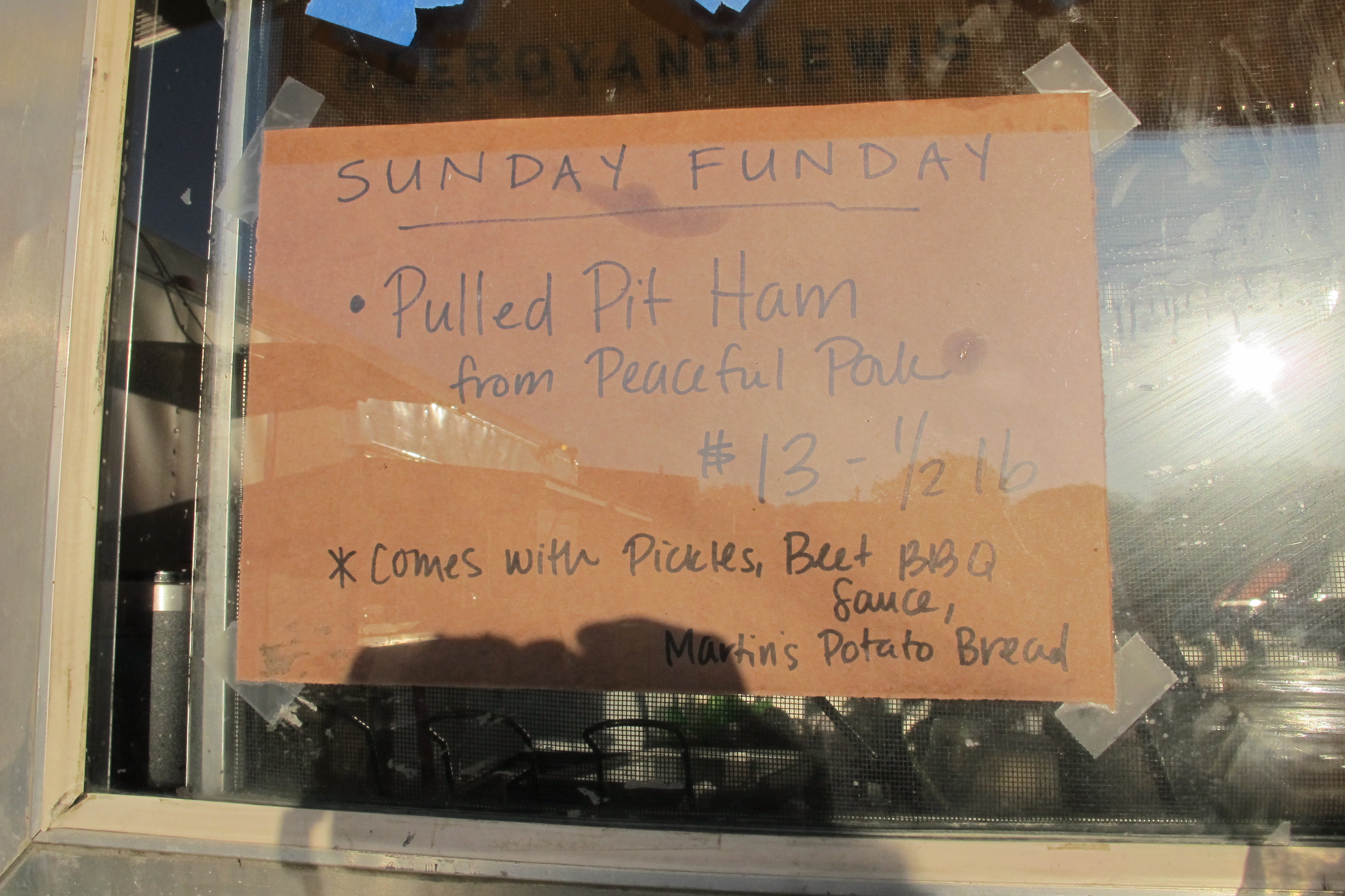 Order: “Pulled pit ham from peaceful pork” sandwich with smoked sweet potato (link to menu)