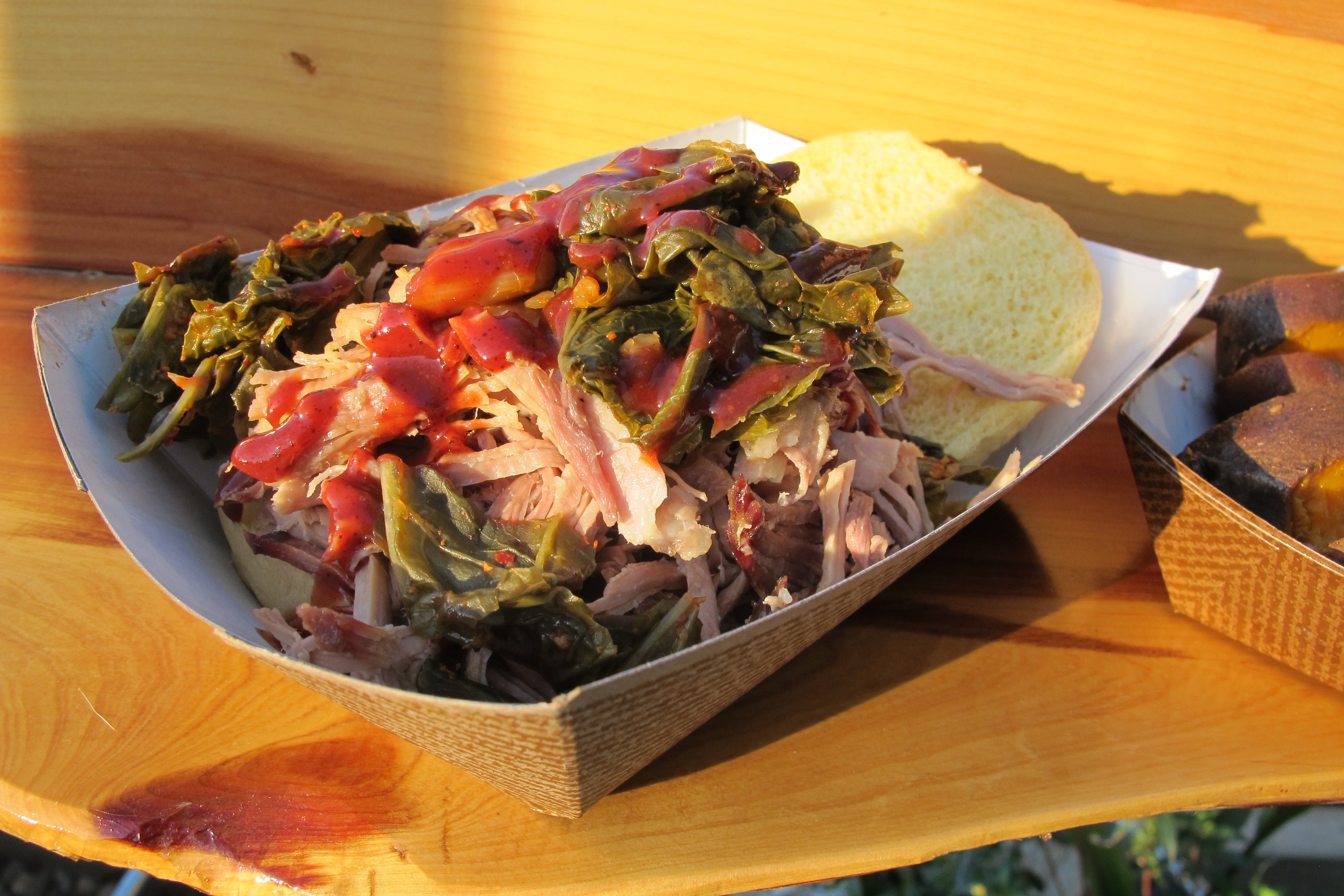 The creativity that I was expecting was evident in the beet bbq sauce that topped the pork sandwich along with some collards. For the last bit of meat before selling out on a Sunday afternoon, the generously portioned sandwich was still fairly tasty.