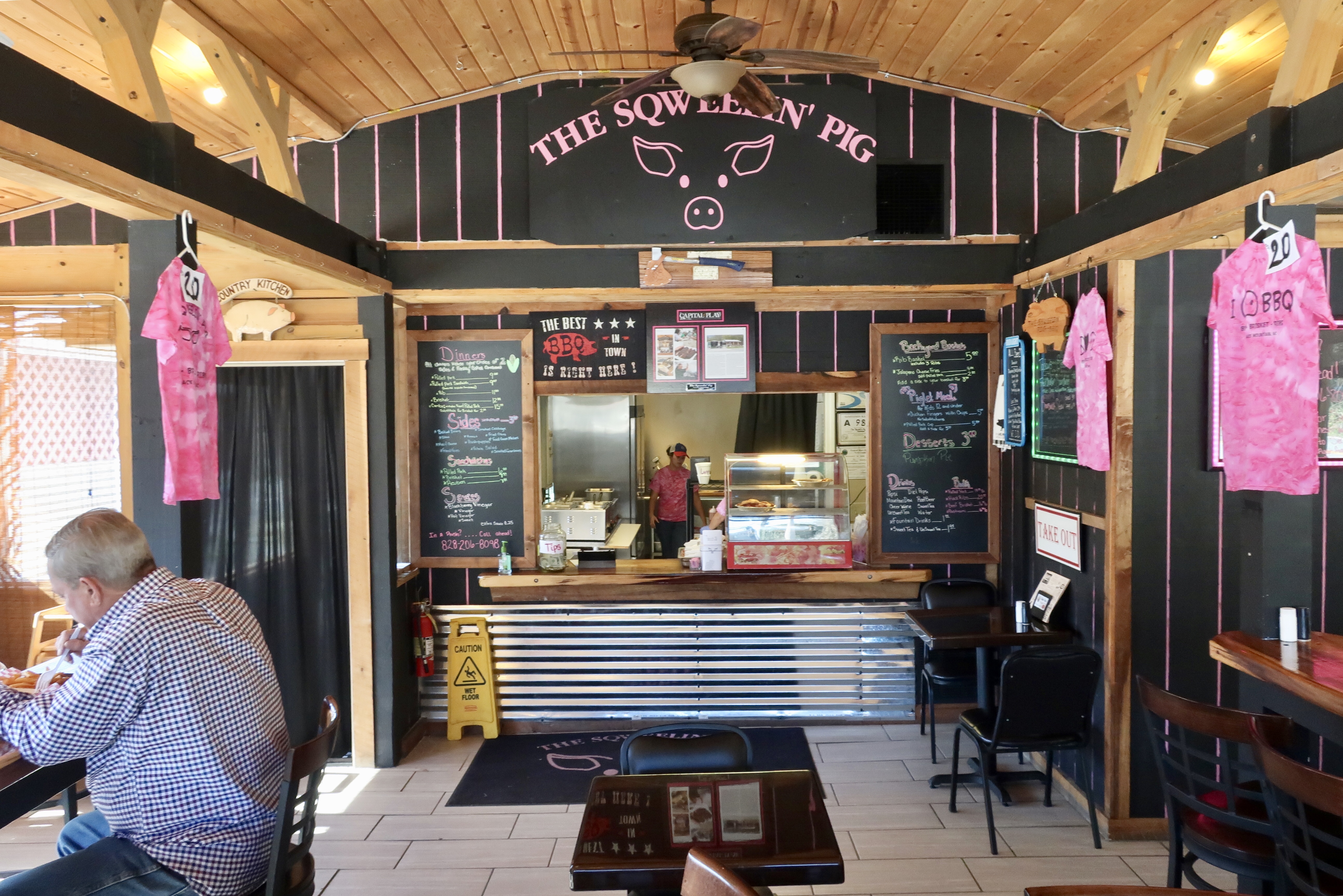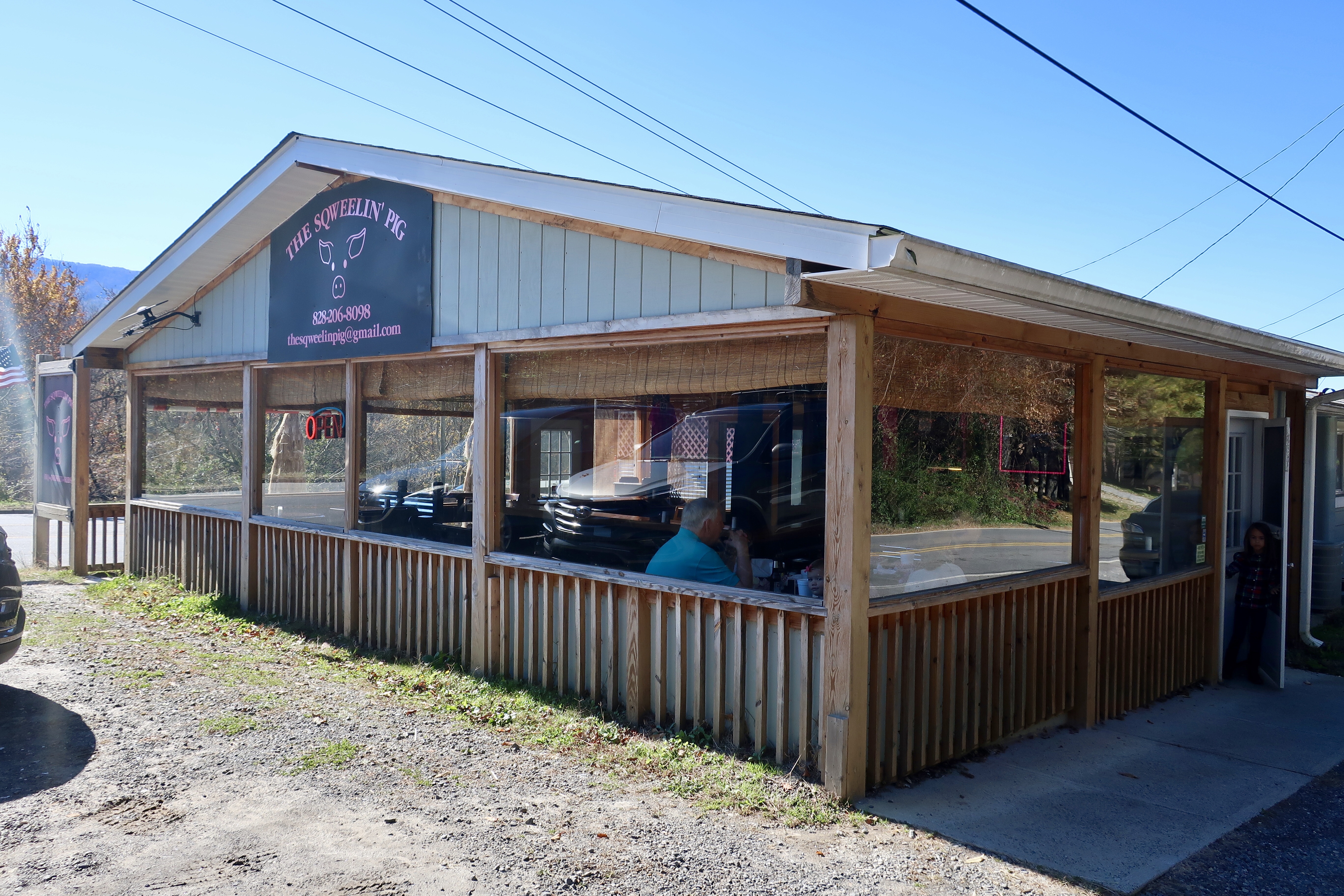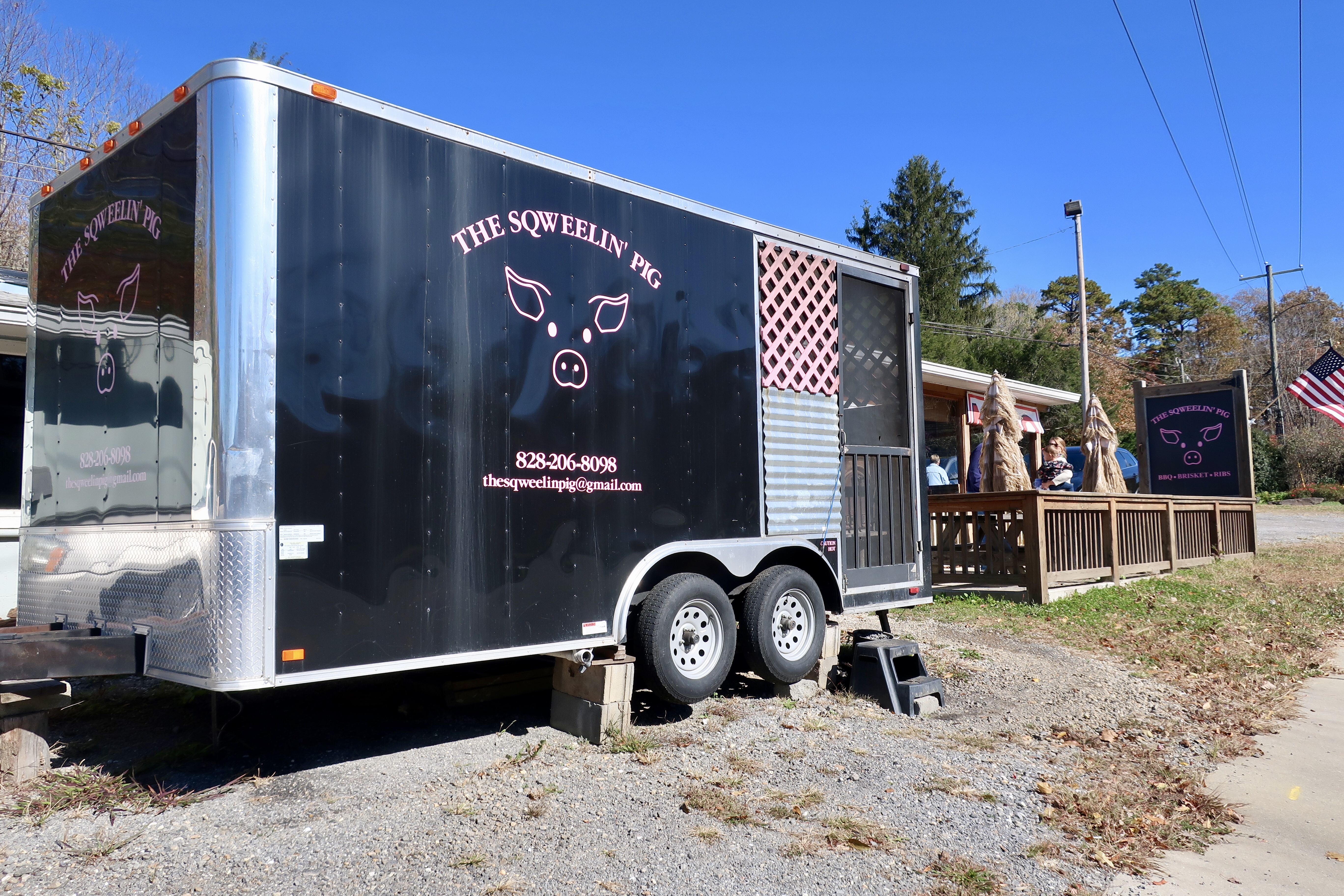 The Sqweelin’ Pig started as a food truck that smoked solely over wood when now pitmaster Buddy Clemons lost his construction job in 2012 and decided to make a late career change to barbecue. It seems as though its working out pretty well for him and his wife (who then quit her own job to help him) as this Black Mountain location that opened earlier this year is the third location after Weaversville and Barnardsville northwest of Black Mountain. Here, a trailer is positioned just outside of the main restaurant with the woodpile stacked against the building.