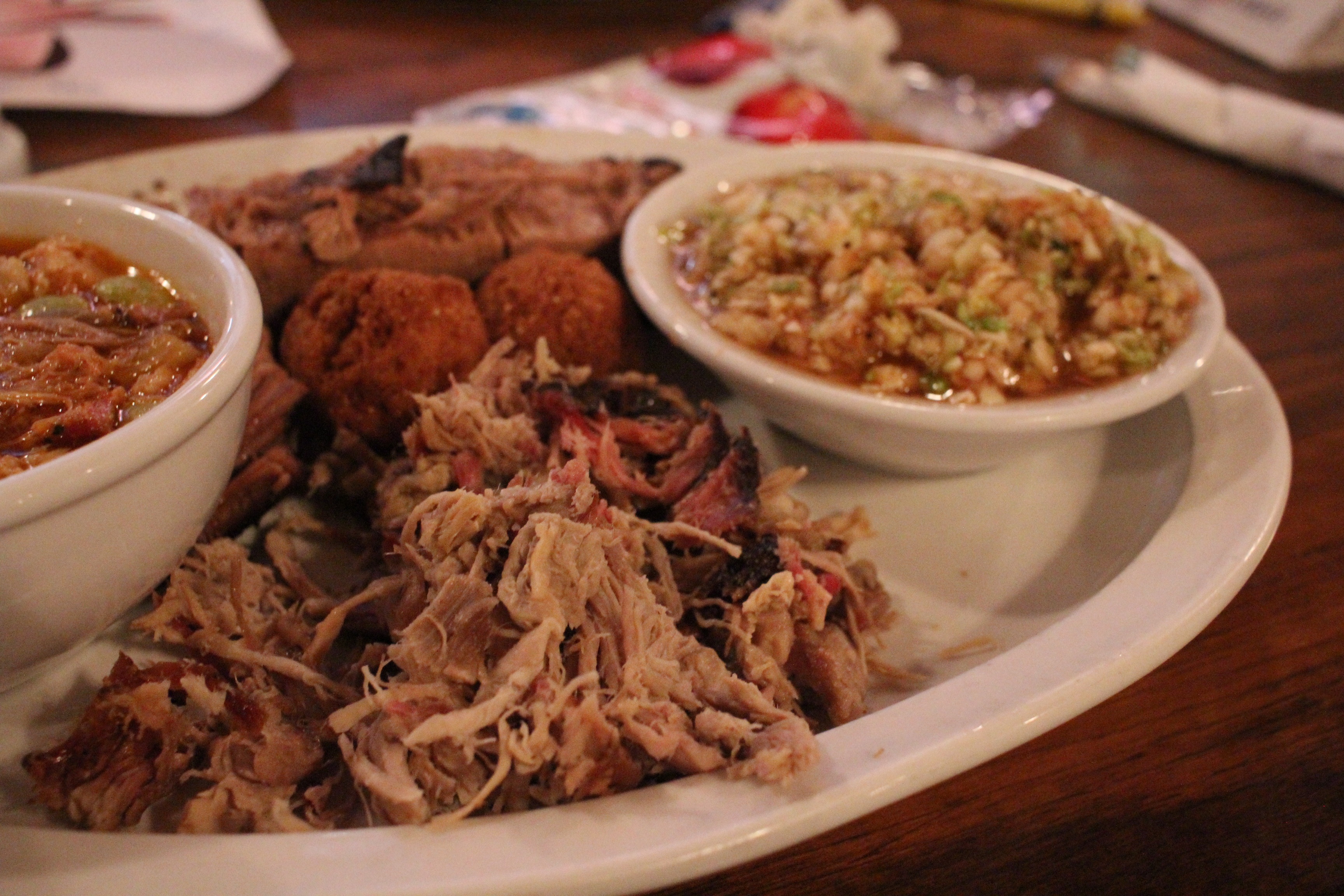 The bbq slaw was a good rendition of a Lexington-style red slaw while the brunswick stew hit the spot on a cold day. Mrs. Monk’s sides of collards and cheddar grits were equally successful.