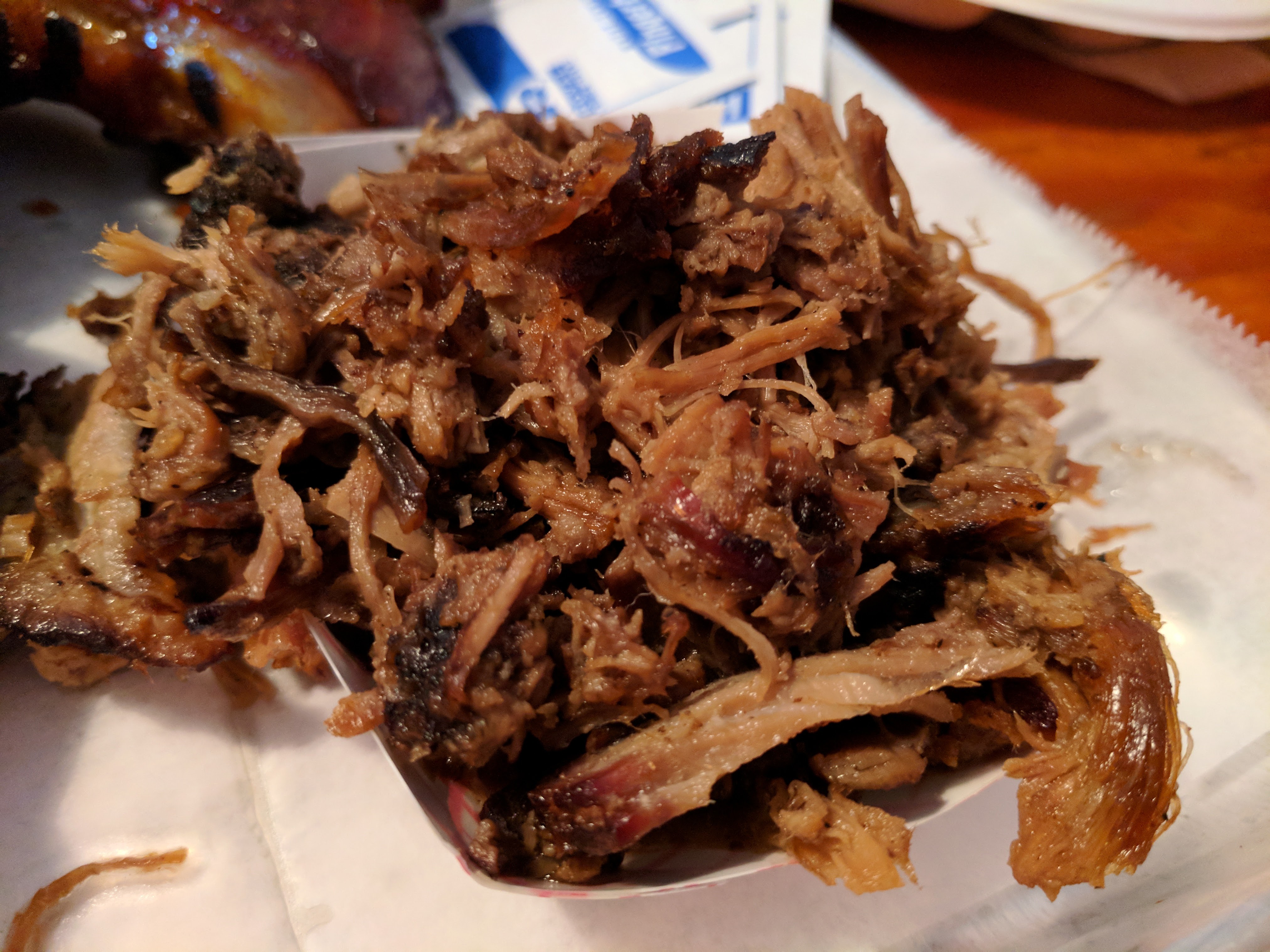 Speedy: For our order, we went with “The Hog” – the smaller of the two combo plates, as we were told the bigger combo (“Pig Out”) was the same plus three more sides. Well, we were there for the meat, so that didn’t seem worth while to us. The hog came with pork, brisket (both chopped), ribs, and wings, so it was basically perfect. We added on red slaw and collards.