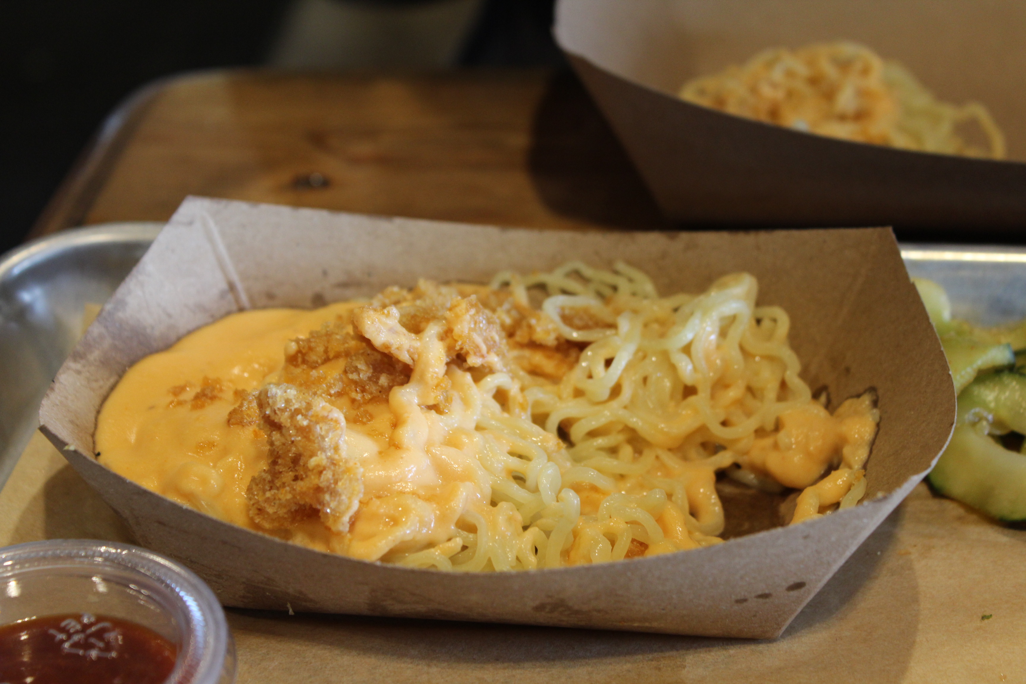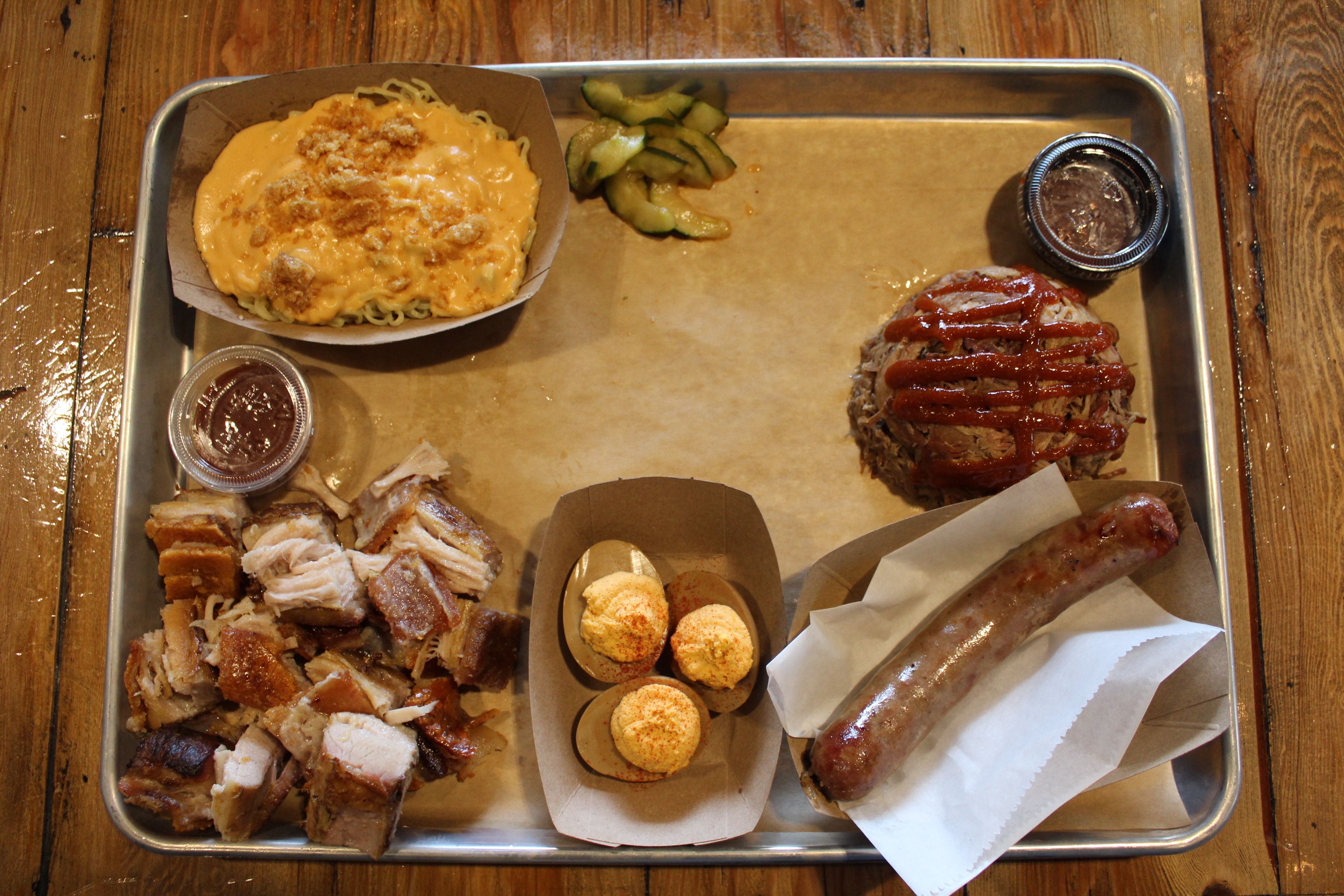Order: Small pulled pork, small Crispy Pork Belly, small Bulgogi Sausage, ramen mac ’n cheese, soy pickled deviled eggs (link to menu)