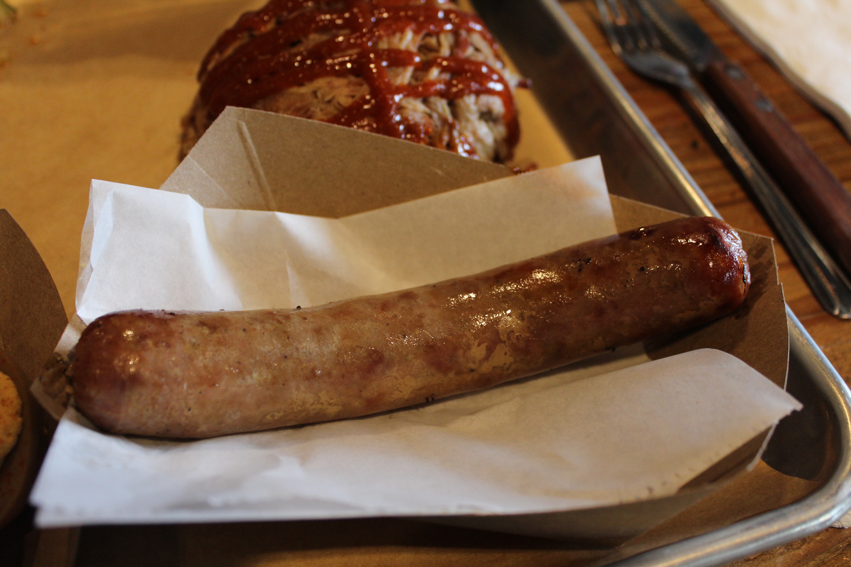 The bulgogi sausage was perhaps a little on the dry side (as can be the case with sausage) but was pretty flavorful nonetheless and my favorite meat of the meal. Mrs. Monk preferred to dip it in the sauce and that was my preference as well. Next time I’d be interested to try their spicier smoked kimchi sausage.
