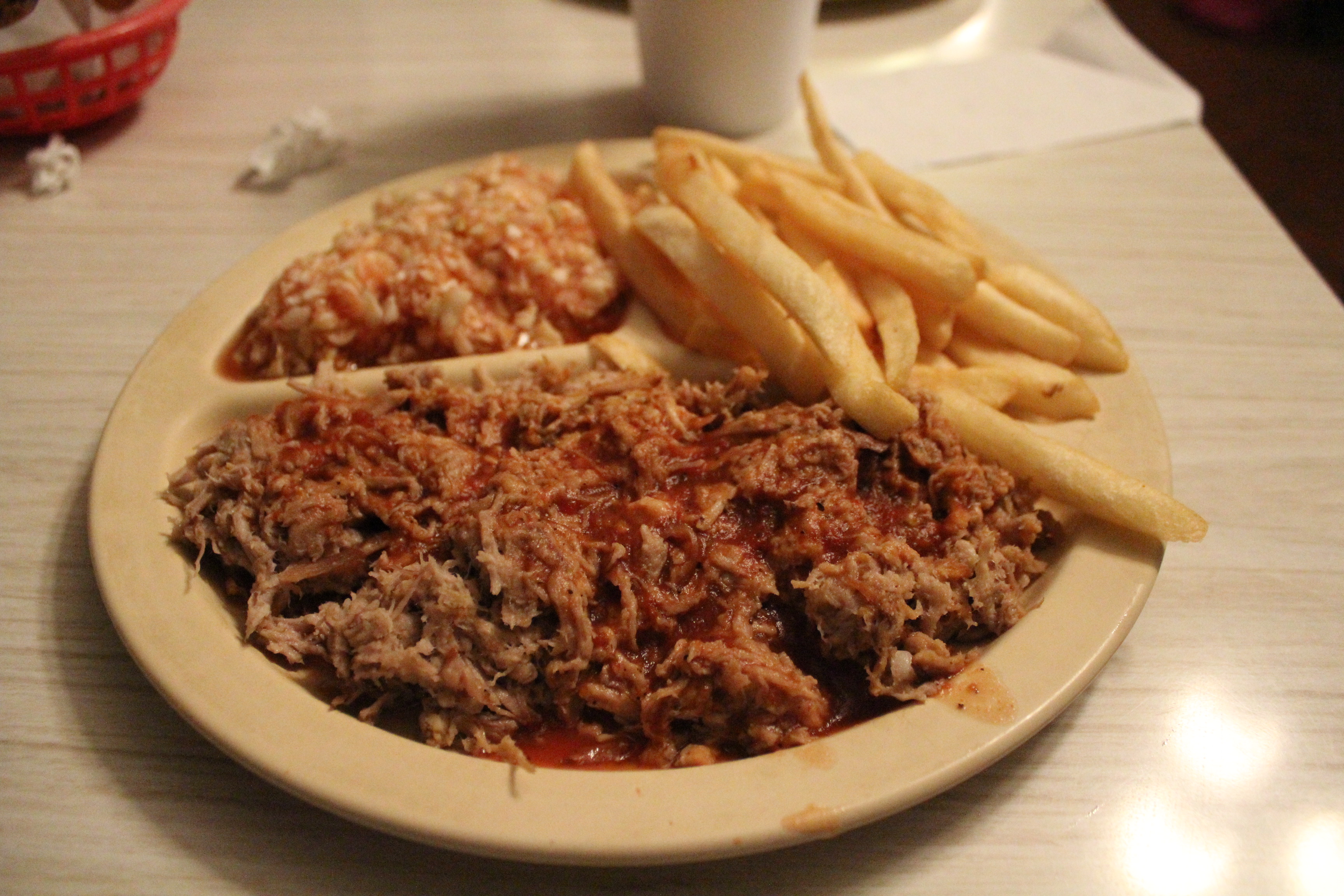 Order: Medium chopped pork plate with bbq slaw, fries, hush puppies, and Cheerwine