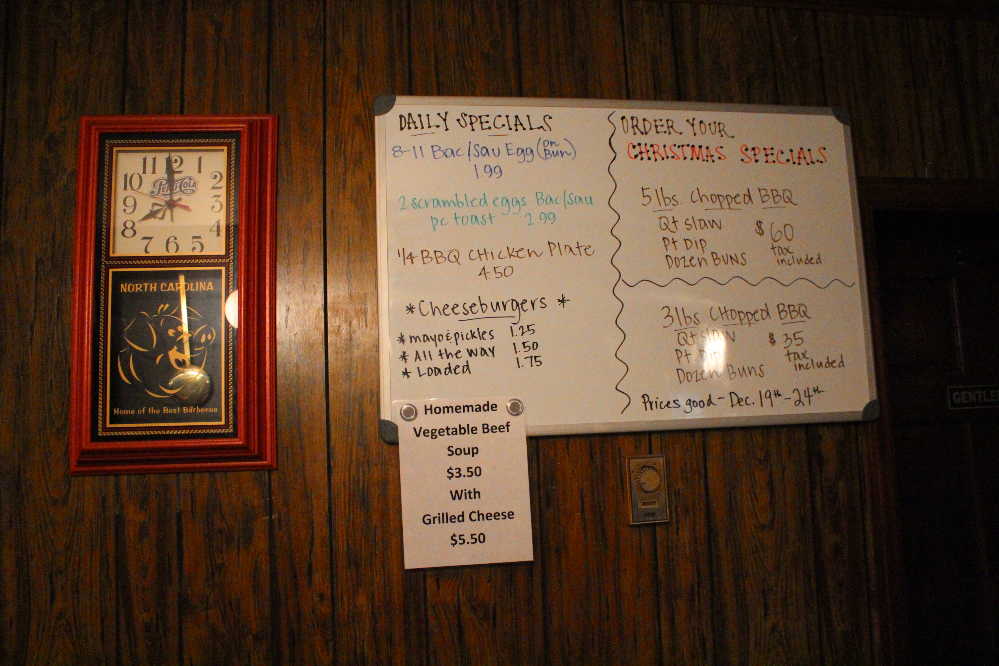 Monk: Much like Rudy I am a father of a toddler and similar to how Mrs. Rudy lured him to a pumpkin patch with the promise of barbecue, Mrs. Monk promised me barbecue if we went to a Christmas Train (yes, this is actually a thing). Located in a modest brick building off highway 109 in the small town of Denton, Troutman’s Barbecue is a 40+ year old joint that is True Cue certified, which means that it smokes pork shoulders over wood (unlike the disappointing but similarly named Troutman’s in Concord).