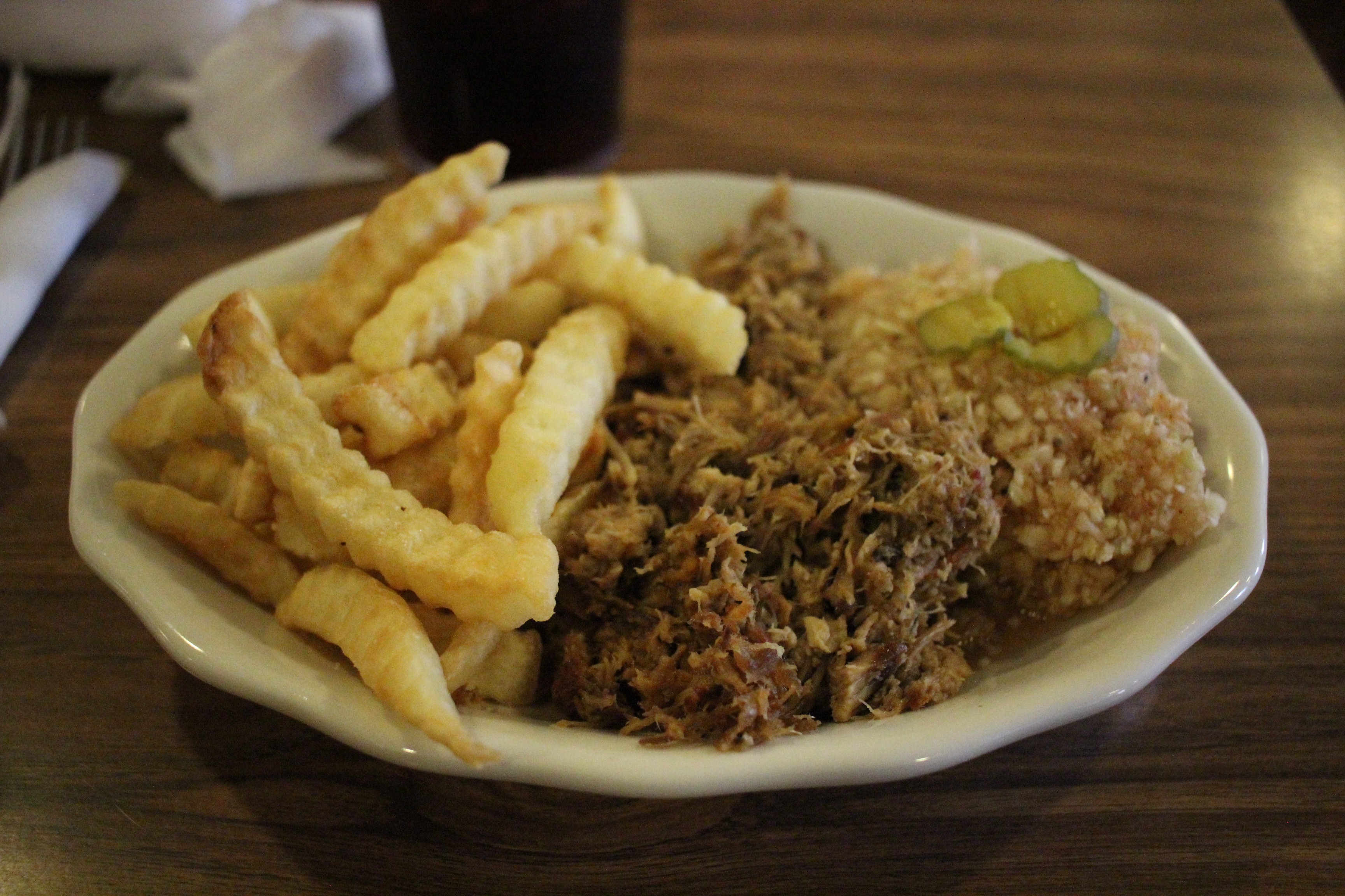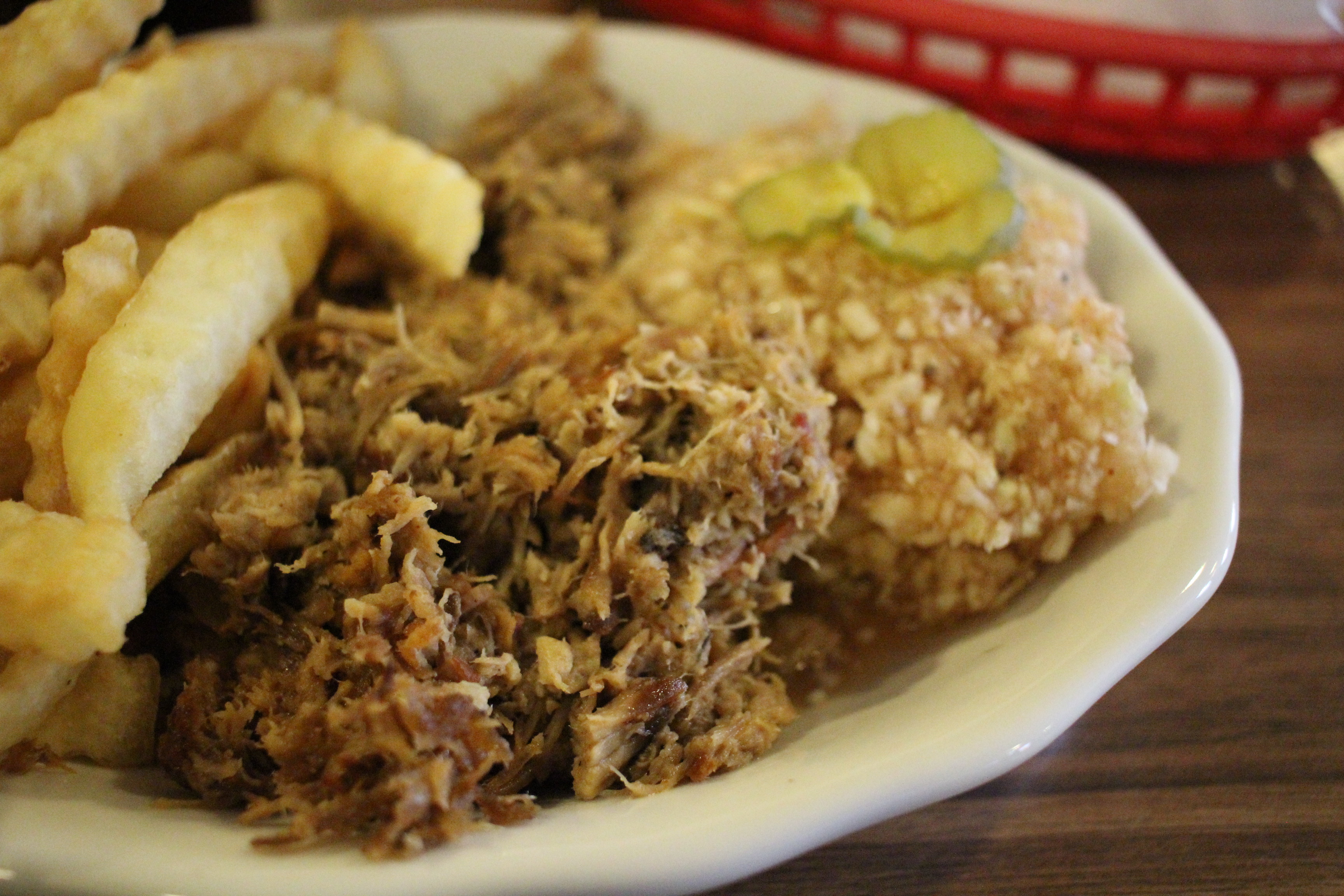 Speedy: The plate looked great – finely chopped pork, red slaw, and crinkle fries. We might as well have been in heaven. Digging in, I was treated to that nice smokey Lexington flavor I love (and miss in Tennessee). The pork was solid, though I think the ratio of ketchup to vinegar in the dip favored the ketchup a little too much. The pork was served with dip, and no extra was needed.