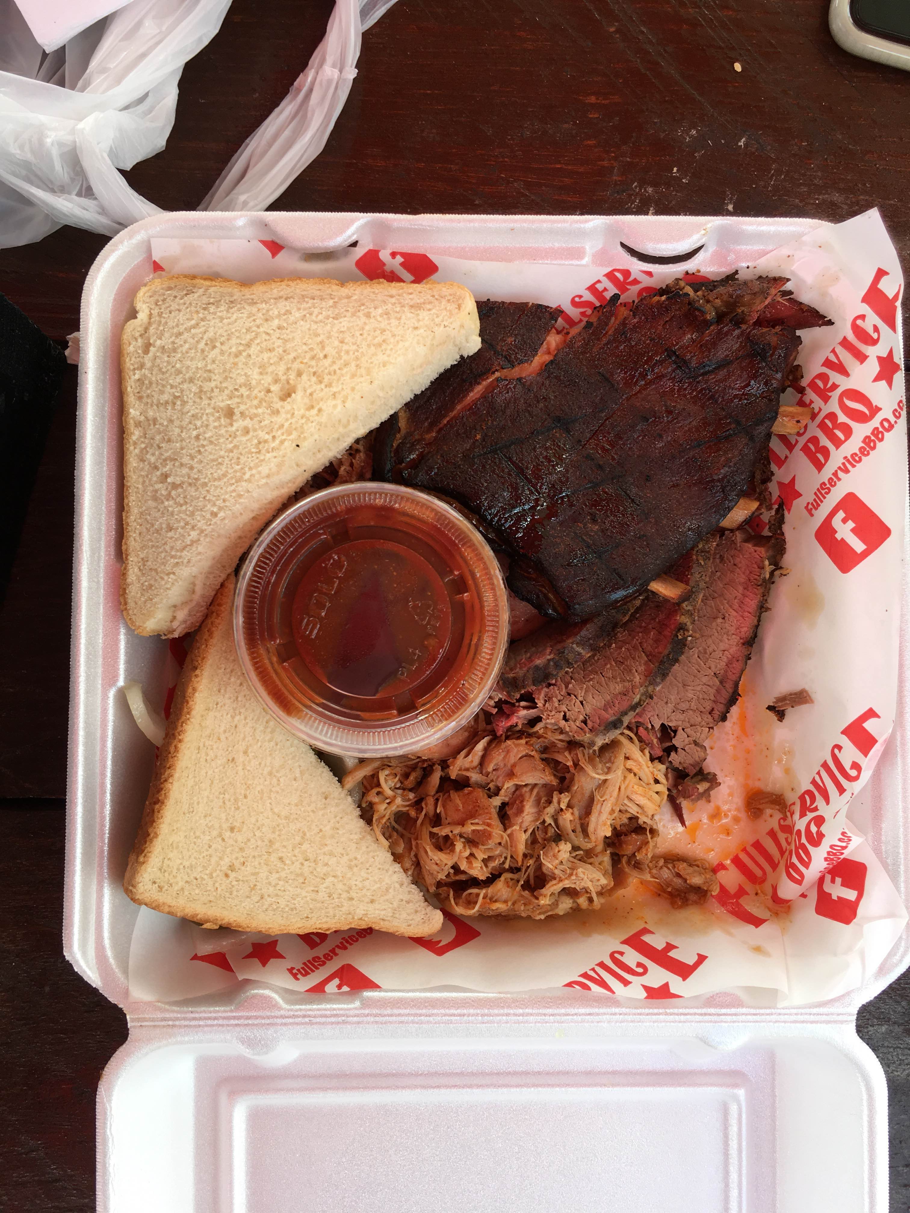 Speedy: And let me tell you – if we didn’t know we were in Tennessee before we got to Full Service, we sure as heck knew it when we got there. There’s no inside seating at Full Service – just places to park your car, picnic tables (complete with napkin logs), and a walk up order window. I thought I was in heaven. That is until I found out that we had just missed smoked wing day (Wednesdays) and were a little too early for burnt end day (Fridays). So while that was a bummer, I was still pumped to try the aptly named Big Boy Box, which I split with Monk, since we’re only medium sized.