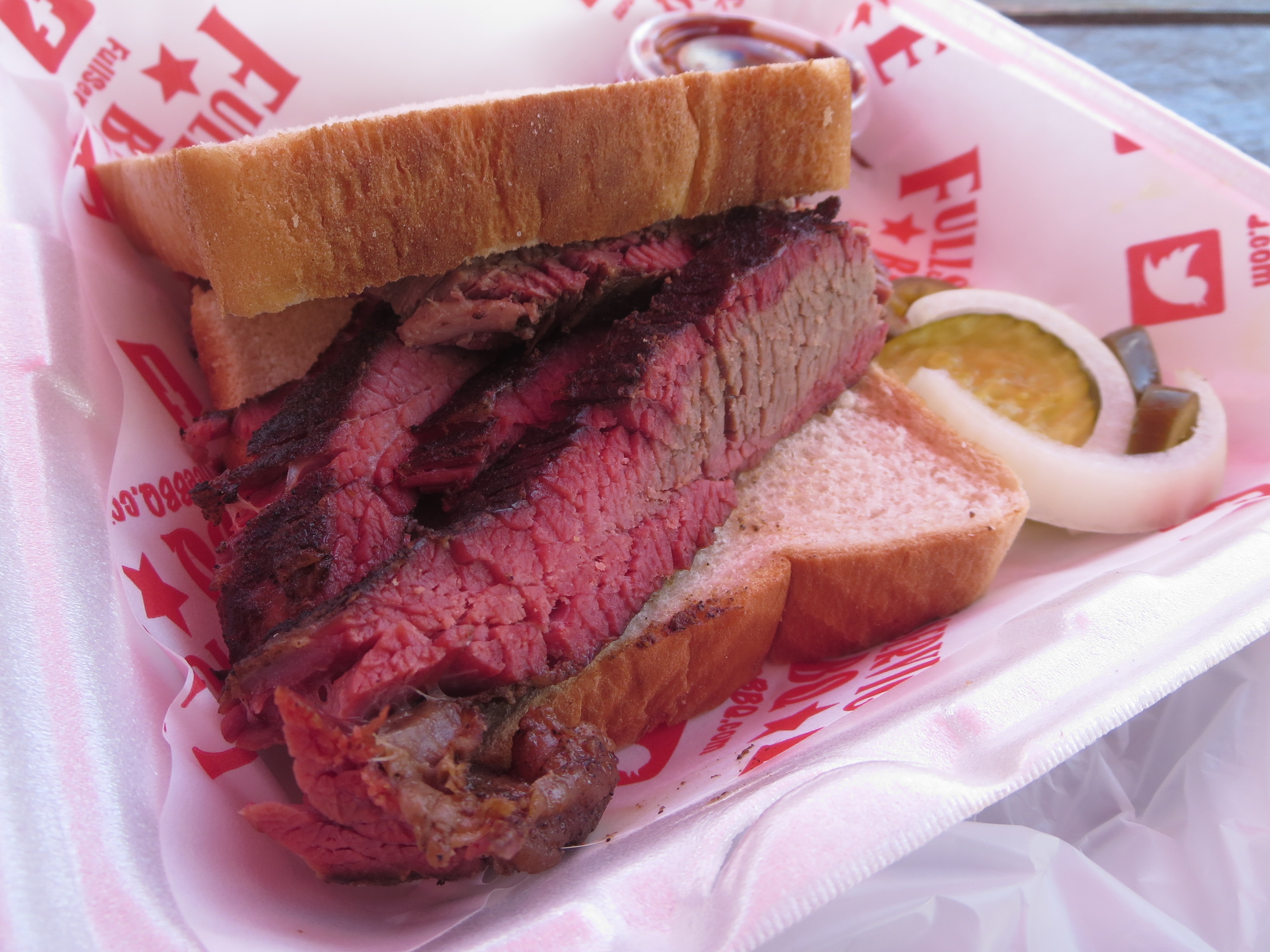 Monk: Fair point…Speedy recalled that Full Service BBQ had been mentioned in Johnny Fugitt’s book The 100 Best Barbecue Restaurants in America, listed as part of the other 75 (though he, like Grant, went to the Maryville location). And when I went back to the book, I realized that the brisket was #3 on his list of “10 Best Briskets Outside of Texas (better than 99% in Texas)” (FYI Midwood Smokehouse which was #6 on the list). That might be a bit high for me, but it was a good brisket nonetheless.