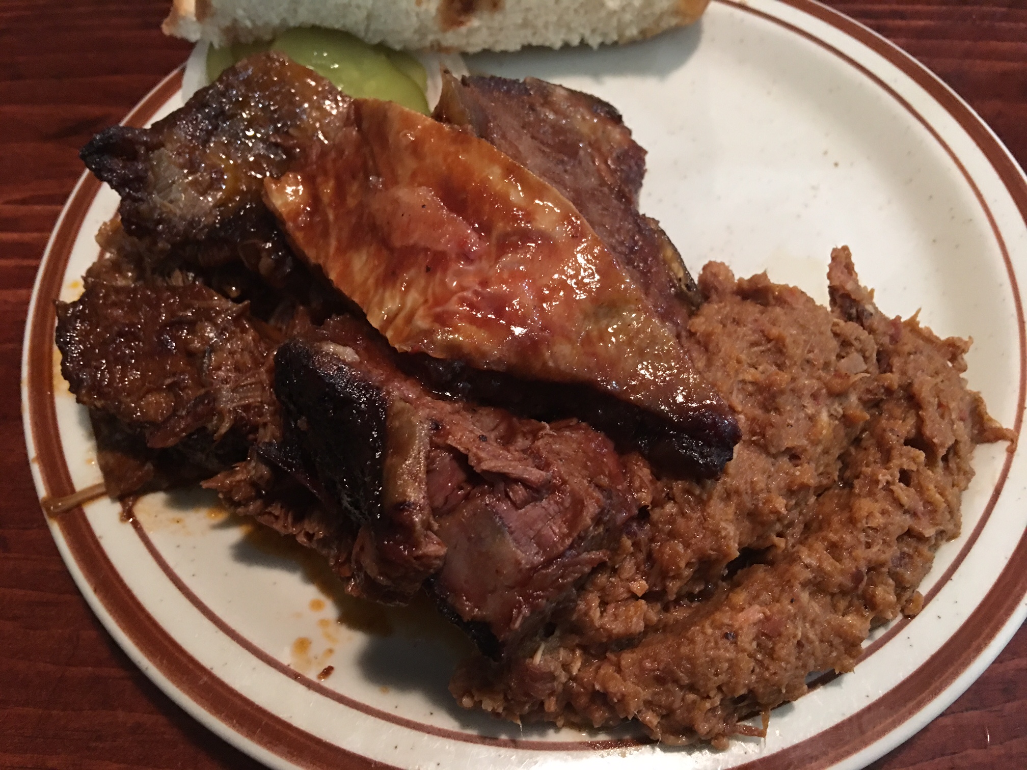 I walked in and was seated at a booth, where I quickly ordered a combination plate with three meats – I chose two kinds of mutton (traditional and ribs) and pork (you can take the boy out of North Carolina…). The food came out quickly and I dug in.