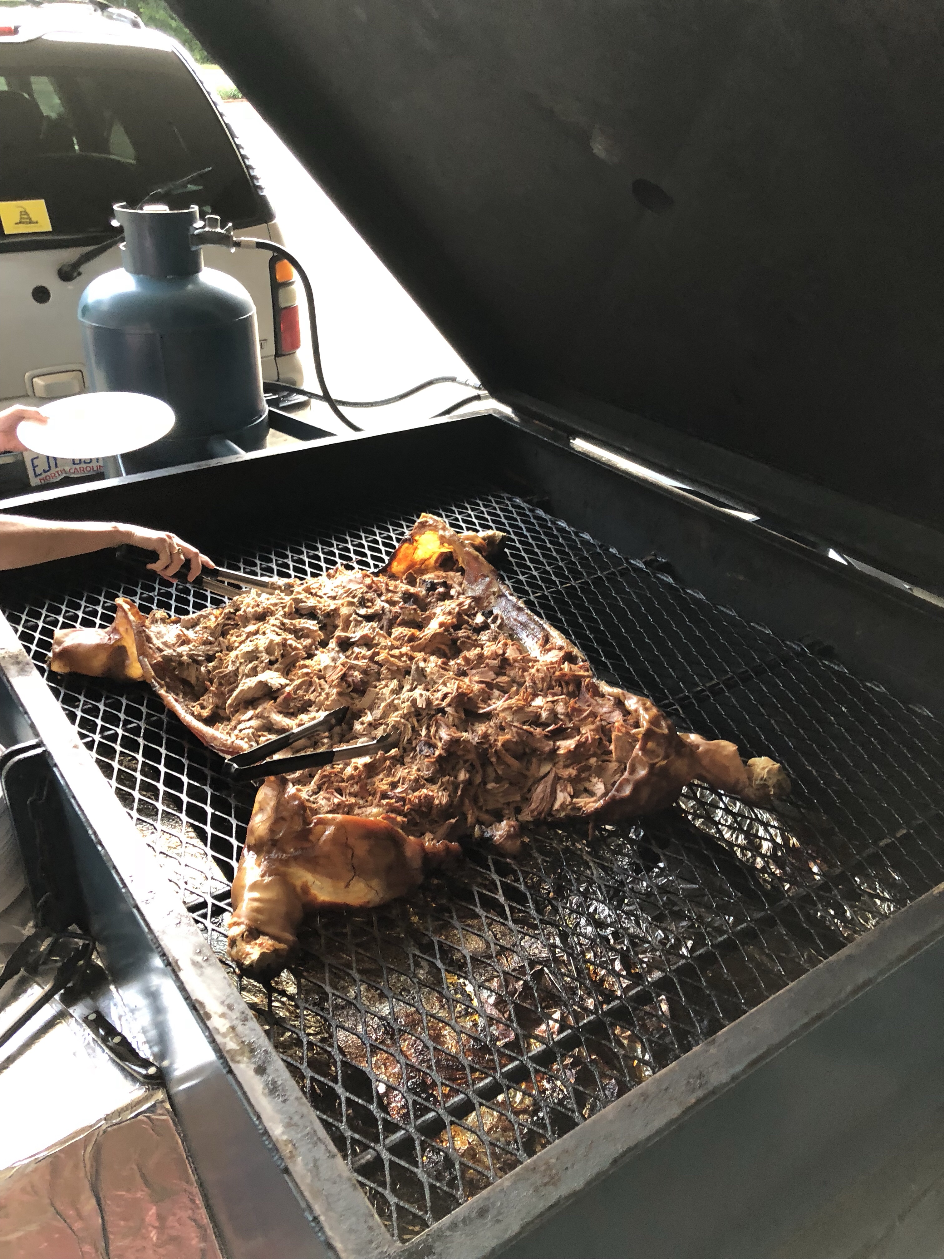 And to my surprise, the two beers on tap were both beers made on campus. And a sour at that! Predictably, the sour was not for everyone and most campers went for the Wolfpack Pilsner. Oh well – more sour for me. Soon enough, it was time for the pig pickin’ and a huge 200 lb porker that had been smoked offsite more than ably fed all of the 30 or so campers plus the 10-15 or so guests. Being in this part of the state, it was of course served eastern style with a vinegar sauce and white slaw. And it tasted amazing. Finally, for dessert peach cobbler with Howling Cow (the ice cream made on campus) capped off the meal perfectly.