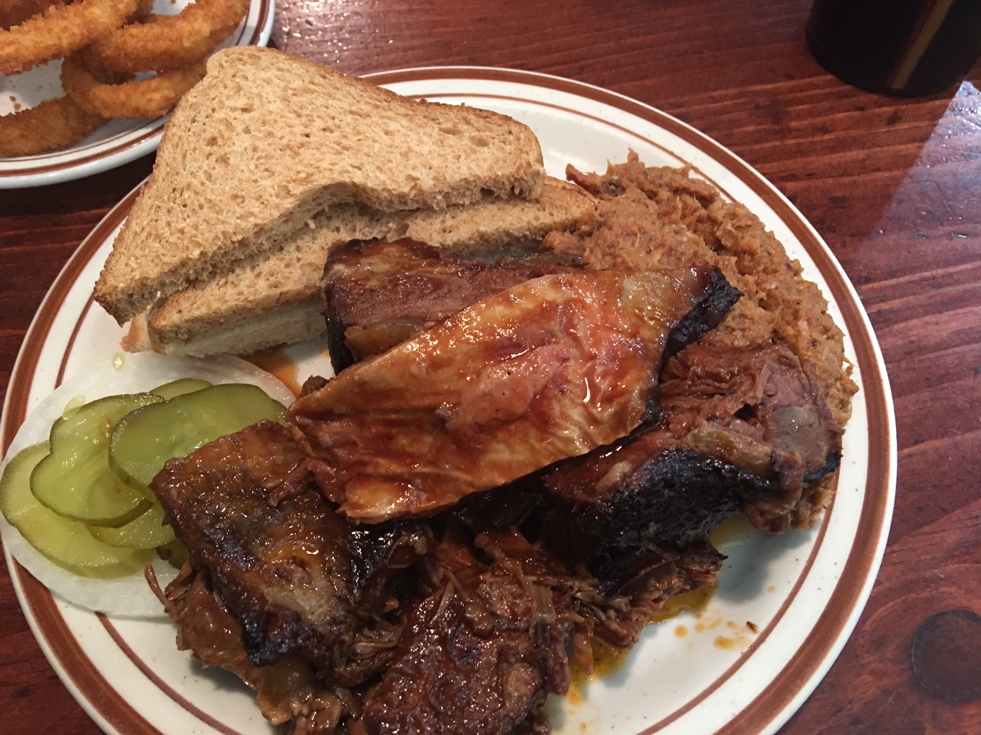 Order: Combination plate – mutton, mutton ribs, pork (fries and onion rings) (link to menu)