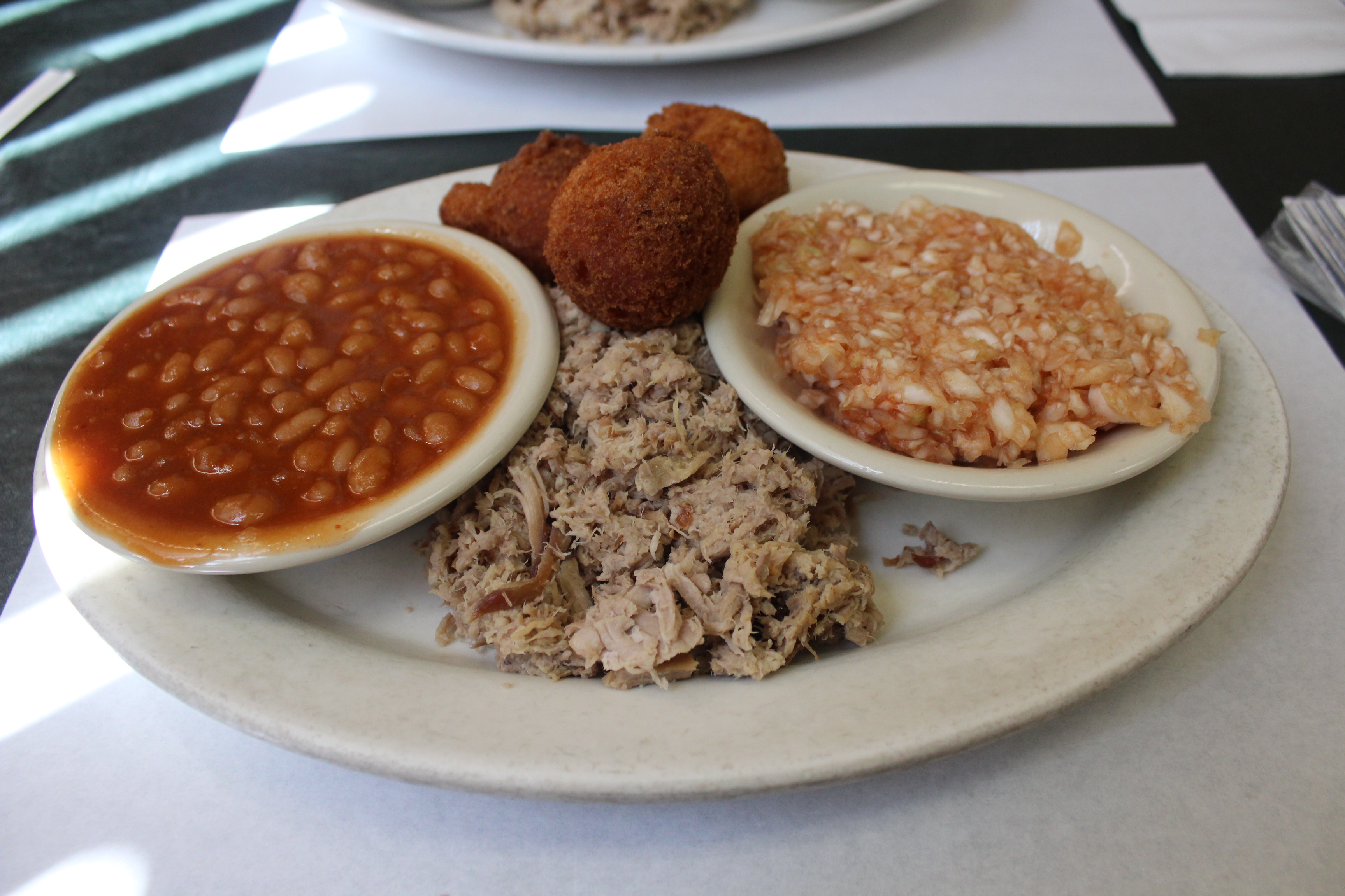 Monk: You do get a choice of coleslaw or barbecue slaw, and the barbecue slaw was a pretty standard version. The beans were passable, though they did remind me of Bush’s from a can. The hush puppies were perfectly fried and the best of the sides.