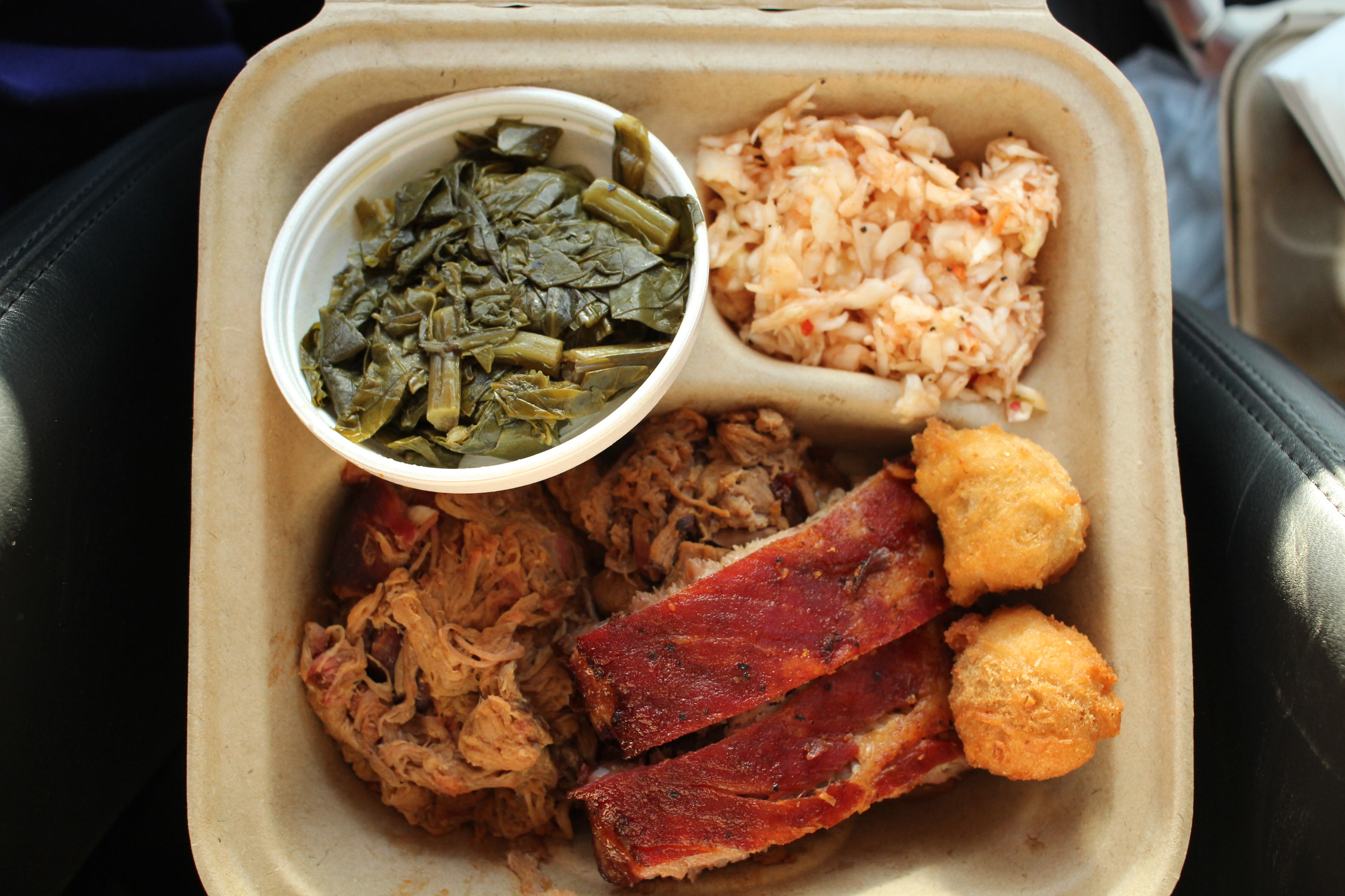 Order: Big Combo (chopped pork, chopped beef, and ribs) with collards and red slaw (link to menu)