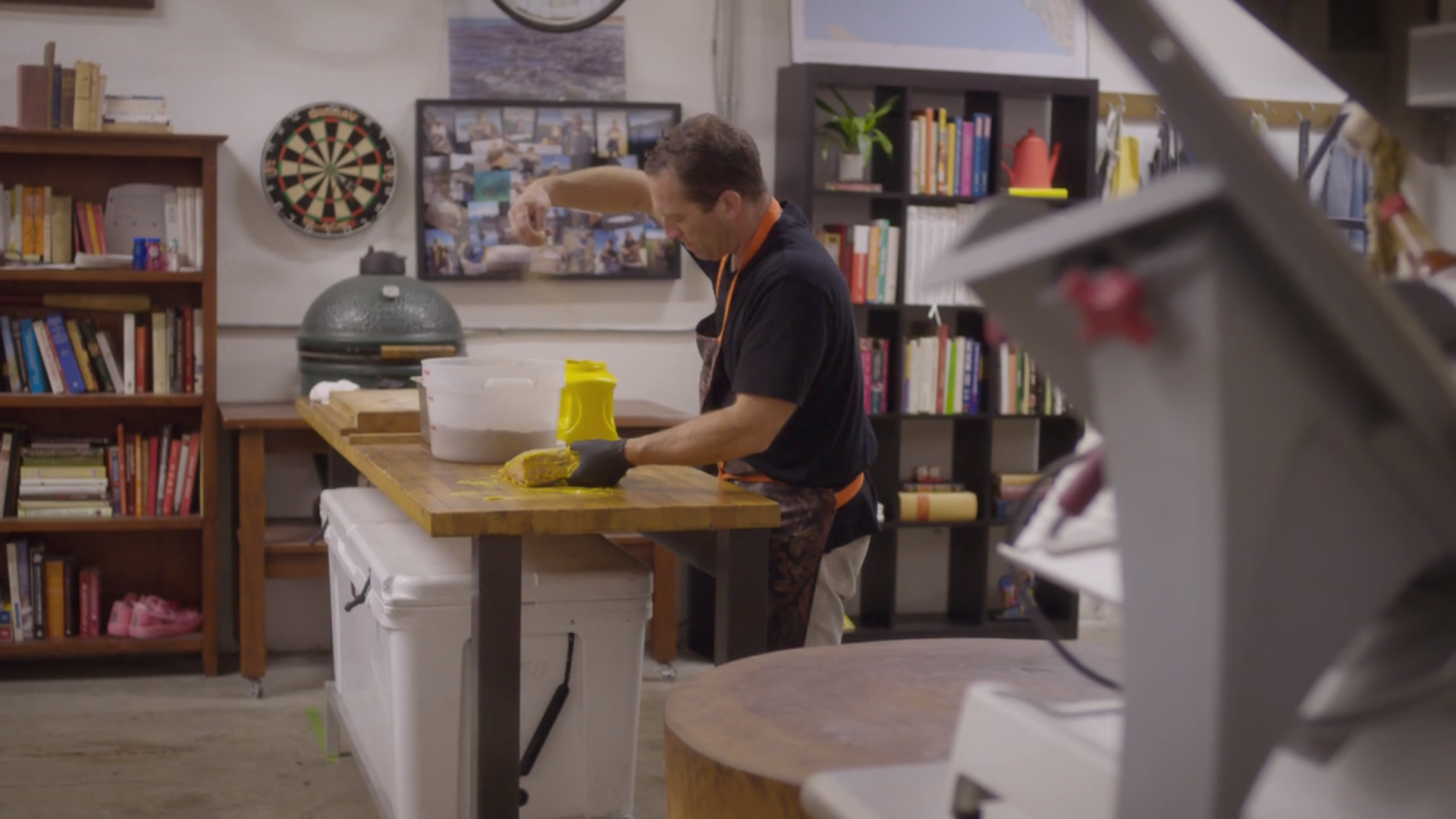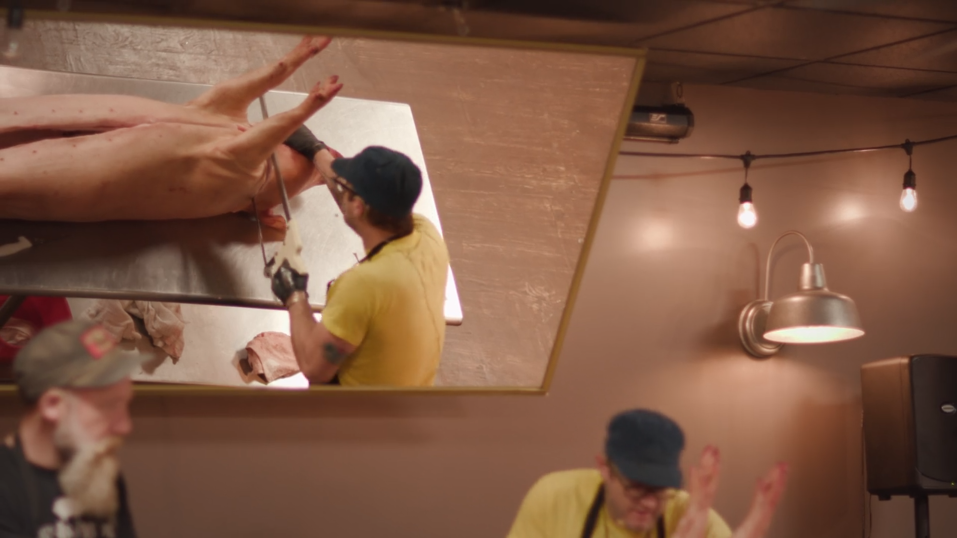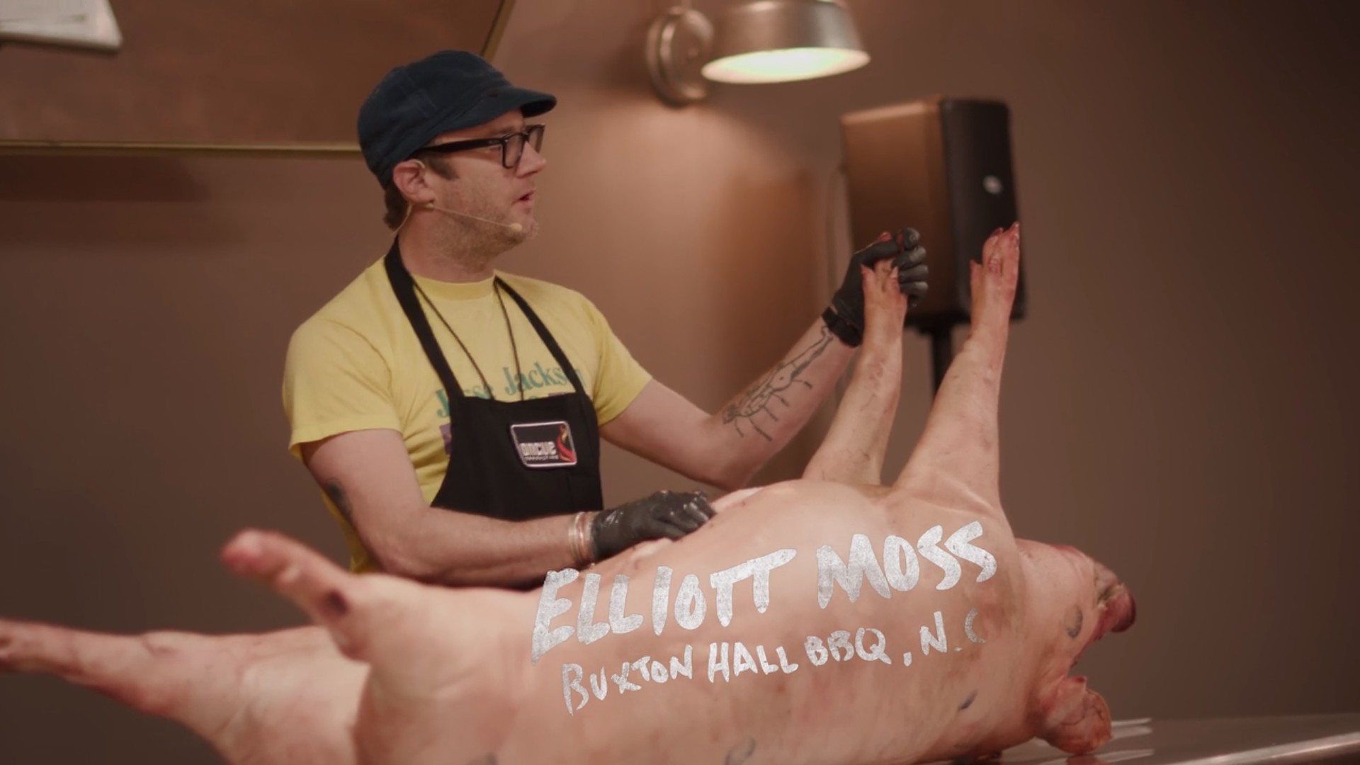 Next, we get an extended scene of Elliot Moss breaking down a pig and explaining his story behind Buxton Hall and why he does what he does (“it’s always been in my heart”). He mentions that being in Asheville means people care about where their food comes from so he uses pasture-raised hogs which are quite expensive. Which for Moss, just means that he uses every part of the animal.